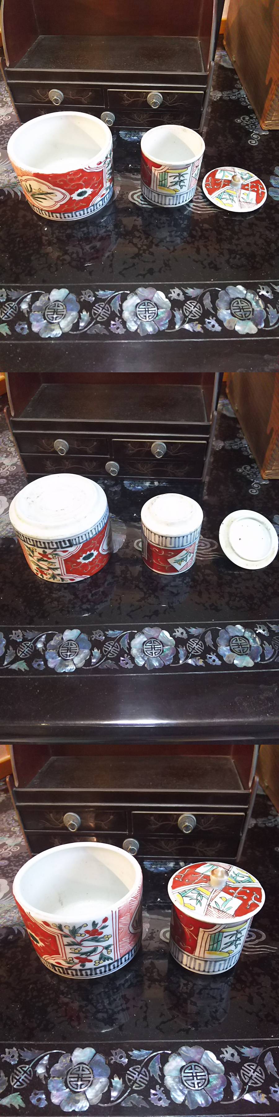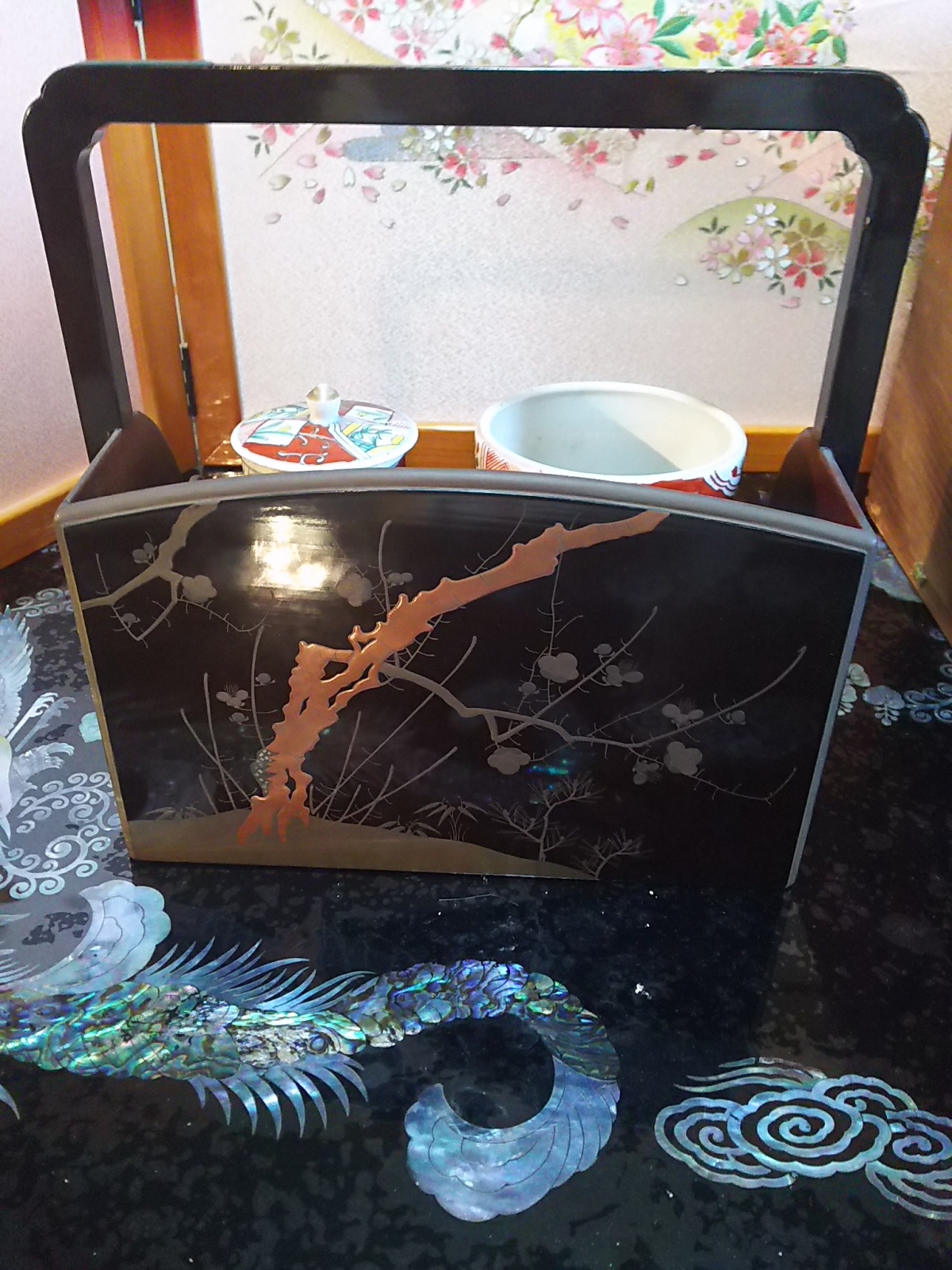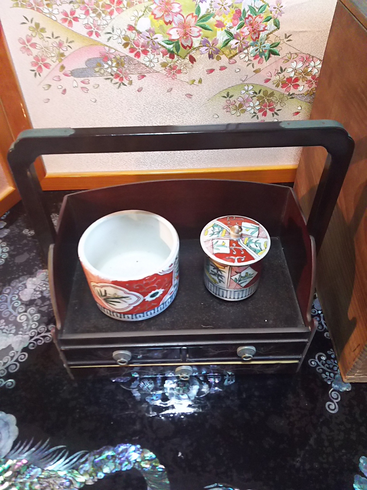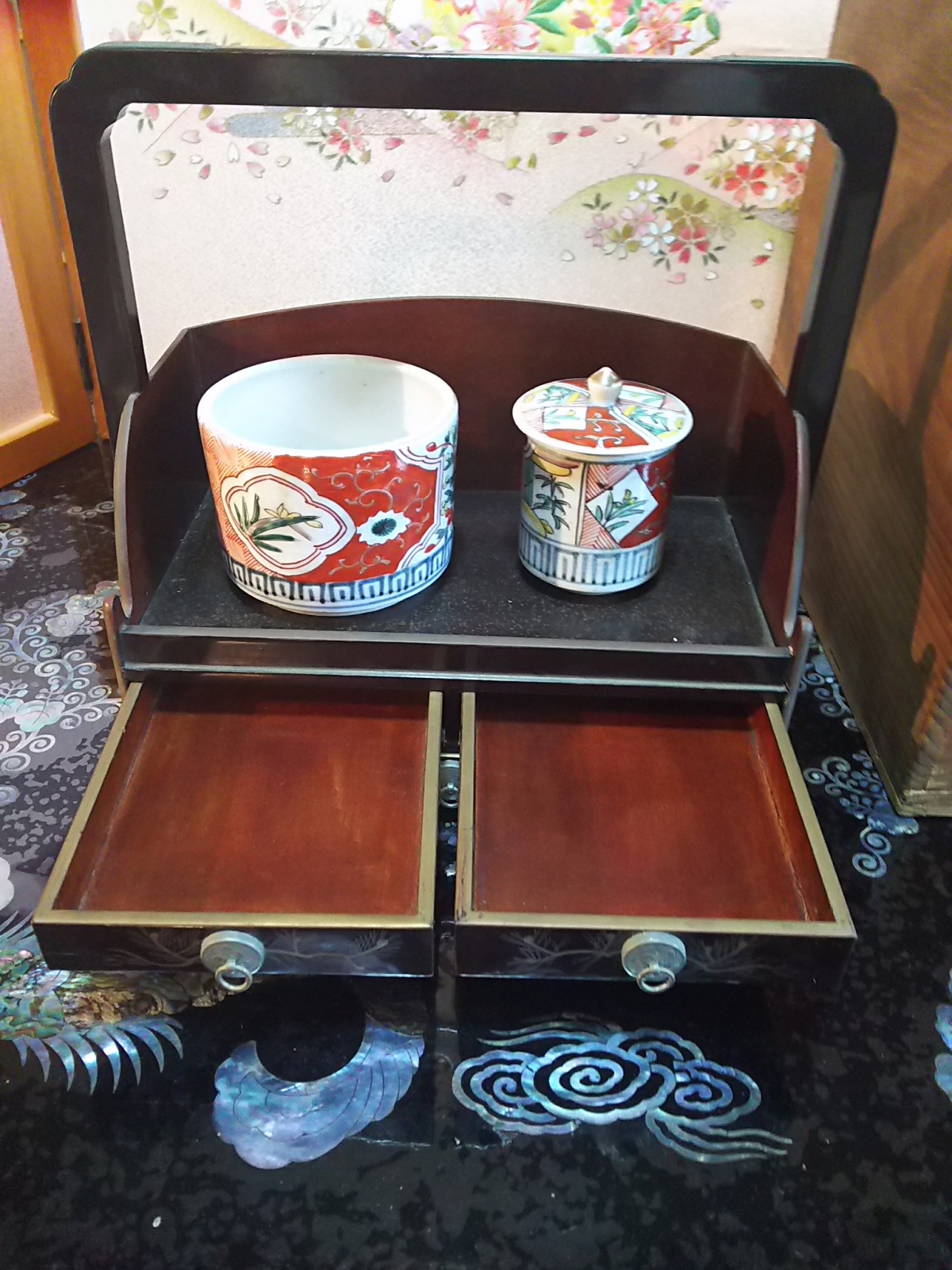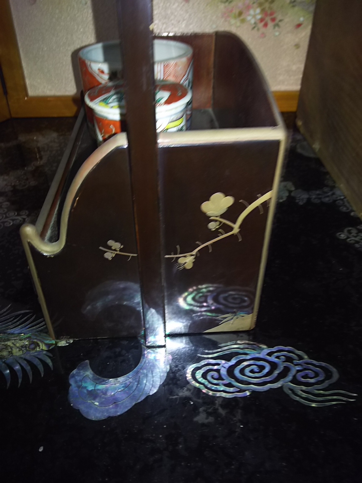 (鳥羽庵)完全売り切り骨董江戸期茶道具懸垂と湯呑漆蒔絵小型 漆塗り金蒔絵棚 古伊万里湯呑みと灰台 サイズ横約25,5センチ 縦台座まで約8,4センチ 取っ手までのサイズ27,4センチ 古伊万里松と梅の金高蒔絵象嵌がはいてます。 時代のあるとても良いお品です。 友箱もついてます。 骨董品に付細かい時代傷等了承御願いします。 詳しくは、写真参照でお願いします。 時代品、骨董品に付ノンクレームノンリターンで御願いします。 発送ゆうパック100サイズ予定で発送いたします。