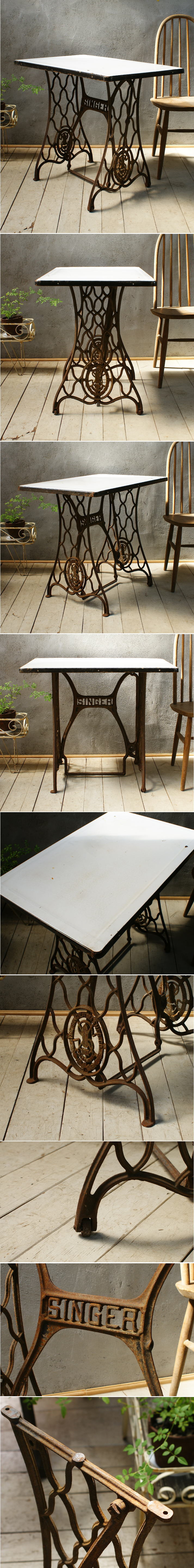 イギリスの蚤の市で見つけてきた、SINGER社製、アンティークアイアンミシン台です。天板はサイズが合うキッチンキャビネットのホーロートップを乗せています。(固定していません、乗せているだけです)使い込まれた風合いがとても素敵です。お部屋の ディスプレイのアクセントにオススメです。お花屋さんや雑貨屋さん等ショップディスプレイの アクセントにもオススメです 送料については商品画像下の送料表参照 D   サイズ幅84cm 高さ71.5cm  奥行53.5cm  T=cm  年代年代推定1930年代(天板は1930~1950)