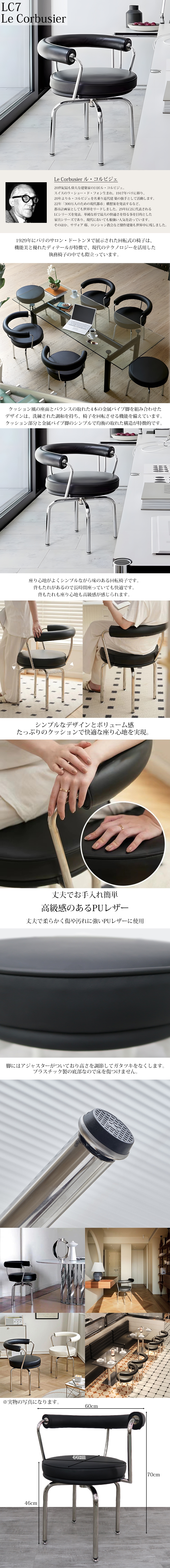 ![]() 1929年にパリのサロン・ドートンヌで展示された回転式の椅子は、 機能美と優れたディテールが特徴で、現代のテクノロジーを活用した 執務椅子の中でも際立っています。 クッション風の座面とバランスの取れた4本の金属パイプ脚を組み合わせたデザインは、 洗練された調和を持ち、椅子を回転させる機能を備えています。 クッション部分と金属パイプ脚のシンプルで均衡の取れた構造が特徴的です。 座り心地がよくシンプルながら味のある回転椅子です。 背もたれがあるので長時間座っていても快適です。 背もたれも座り心地も高級感が感じられます。 アジャスター付き 脚にはアジャスターがついており高さを調節してガタツキをなくします。 プラスチック製の底部なので床を傷つけません。 ■商品詳細 デザイナー:ル・コルビジェ/ Le Corbusier サイズ(約):幅60cm*奥行き50cm*高さ70cm*座面高46cm*座面直径44cm 重量(約):6.7kg 材質: ブラックレザー(PVC) 脚部分:ステンレス ※簡単な組み立てが必要になります。 ※この商品はリプロダクト品になります。Cassina社の商品ではありません。 |