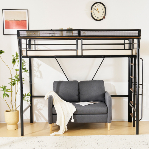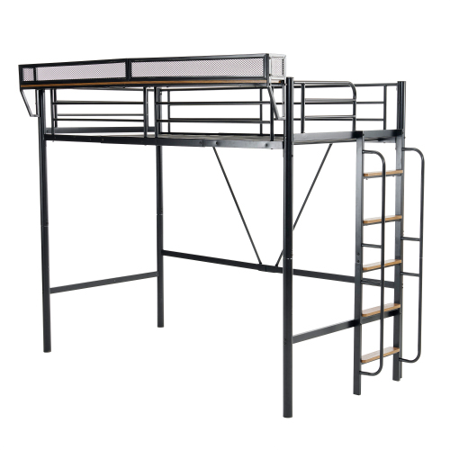 【ブラック】システムベット 宮棚 ロフトベッド シングル 手すり付き階段 便利な側面収納 北欧風 大人用  スチール 耐震