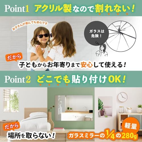 【基本仕様】 アクリル製で軽量・割れにくく、万が一落下しても飛散しません。 また、角を丸くカットしているため、キッズスペースや赤ちゃんのいる場所でも安心してご使用いただけます。 玄関の確認用ミラー、姿見、クローゼットミラーなど、さまざまな場所で活躍します。 AHEARTのミラーは、専門家によるW監修のもと開発された「どこでも貼れる・割れにくい理想のミラー」です。 ※浴室でのご使用は不可となっております。