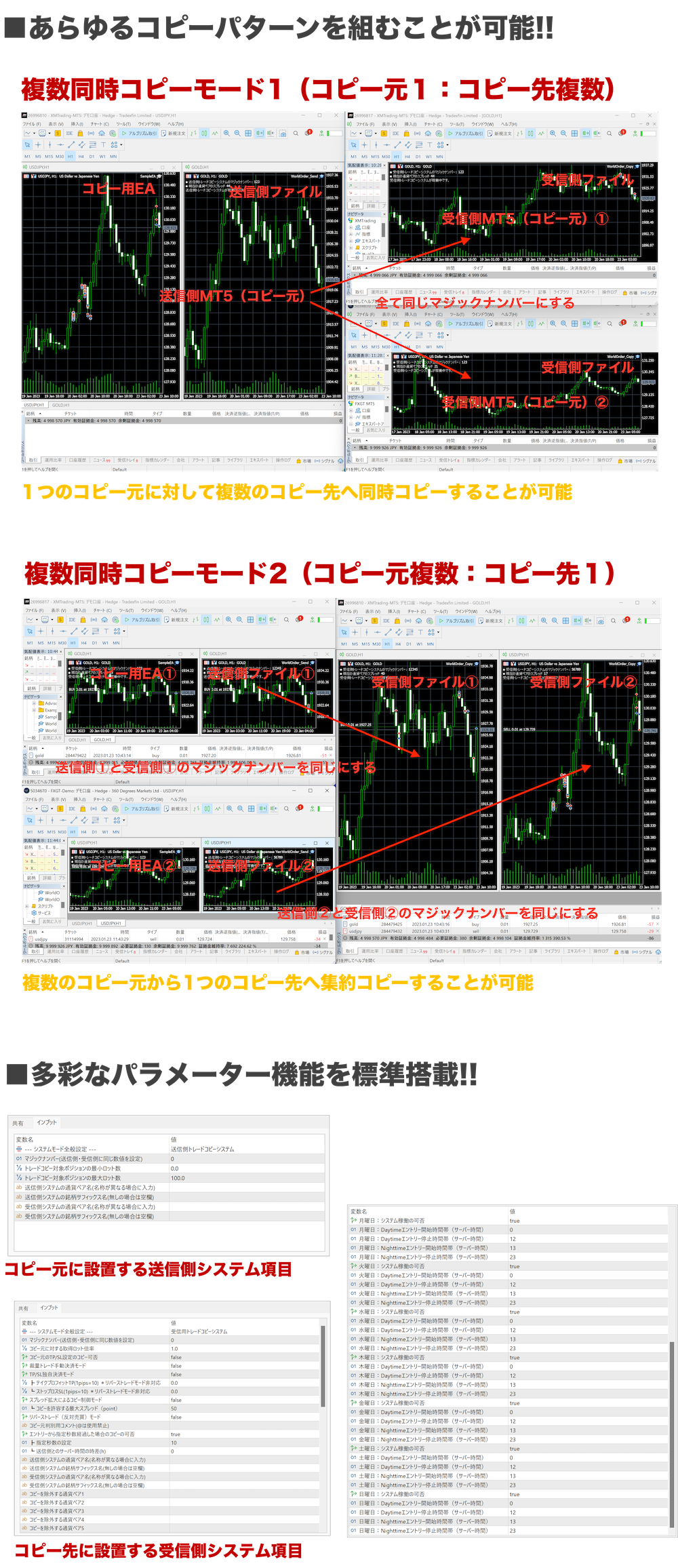 |  1対1のシンプルなコピーはもちろんですが、 複数のコピー元から複数のコピー先へ瞬時にコピーさせることができるので コピーパターンは無限に組むことが可能です。 もちろん、MT4とMT5を組み合わせてコピーが可能です!! 細かい設定も可能で豊富な機能が搭載させており、複数同時コピー対応に加えて 稼働時間の制御など前述の10つの稼働設定モードを実現可能です! 【WorldOederで問題なくできること】 ■口座①→口座②へシンプルに完全コピーできます。 ■口座縛りやデモ口座縛りのEAをコピーできるので縛り自体を完全に無効化できます。 ■コピーしない通貨ペアを指定できるので、必要な通貨ペアのみをコピーさせることができます。 ■月曜日から日曜日まで曜日ごとの稼働のオンとオフを自由に選択できます。 ■1日を2つの時間帯に区切って稼働できるので、重要指標発表の時間帯だけを避けることが可能です。 ■指定秒数を設定して、コピー元からコピー先に何秒以内ならコピーするかを設定できます。 ■ MAM口座や閲覧用の口座もコピー可能です。 ■コピー元を簡単に判別できるように、任意のコメントを入力できます。 ■ GOLD→XAUUSD、SILVER→XAGUSDなど異なる銘柄名でもコピー可能です。 ■スタンダード口座マイクロ口座等の口座通貨数に関係なく自由にコピーできます。 ■コピーする最小・最大ロット数を指定できるので、途中からコピーして利益を倍増できます。 ■本人名義の口座だけでなく、家族や知人など名義違っても同一環境であればコピー可能です。 ■EAやMAMのコピーだけでなく裁量トレードのコピーも可能です。 ■エントリーだけコピーして、決済は自分の判断で行うことができます。 ■コピーしたポジションにTPとSLを設定して独自決済させることが可能です。 ■勝率の悪いEAのポジションを反対売買でコピーすることもできます。 ■FX通貨ペアだけでなく、ビットコインなど仮想通貨CFD銘柄にも対応しています。 ■MT4またはMT5を採用している証券会社であれば、国内・海外問わずコピーが可能です。 | |||