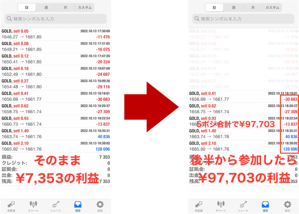 | お次は、部分的に収益が増えるポジションだけをコピーするやり方です。 これは巷で流行りのナンピンマーチンEAに有効的な方法で ナンピンポジションが増えた時に、後半のロットが高いポジションだけコピーします。 これは見てもらった方が早いので、下の画像を見てみて下さい。  ね?確実に増えちゃってますよね。 その差は10倍以上! かなりの爆益が取れちゃいます。 なので、よくナンピンする爆益型のEAなんかに最適です。 | |||