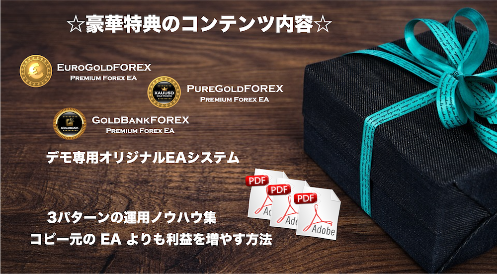 |  すでにコピー元にしたいお気に入りのEAがある場合はそれを使うと良いのですが まだお気に入りのEAを持っていないという場合は、 過去作のEuroGold、PureGold、GoldBankのEAシステムのデモ版を特典としてお付けします! デモ専用版なので、リアル口座では残念ながら稼働しませんが お手持ちのデモ口座にセットして、コピー元のEAとしてお使い頂けます。 そのため、コピー元とコピー先の両方で利益をW取りすることは出来ませんので もしコピー元でもリアル口座で稼働させたい場合は お手数ですが、現在出品中のEAシステムをご落札頂けると嬉しいです。 なお、こちらの特典についてはあまり多く配布するつもりはありませんので 時期を見て削除させて頂く予定です。 なので、もしデモ版が欲しいといった場合は今がチャンスです! さらに、当コピーツールを使用してコピー元よりも利益を上げるための 3パターンの運用ノウハウをご用意しました。 ノウハウと言っても裏技的なものではなく、冒頭でもお伝えした内容を もう少し詳しく掘り下げた再現性のある真っ当な内容なので 理解を深めて頂くと、きっとあなたのお役に立てるノウハウになっていると思います。 それらをうまく活用することで利益伸ばしていける内容なので こちらの特典も最大限に活用して頂きたいと思います! | |||