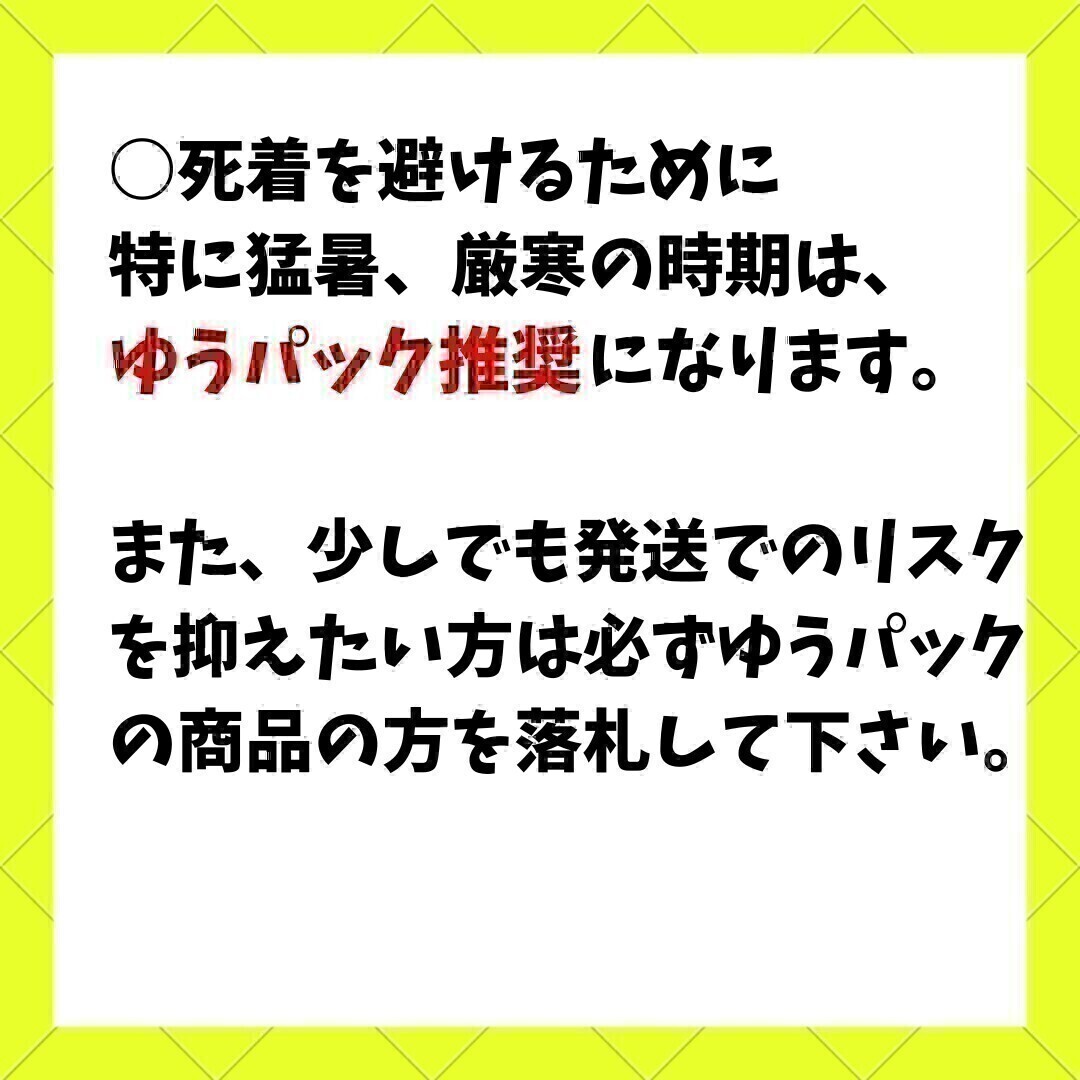 ネコポスは死着へのご対応は難しく代わりに2割多めの重量にて梱包しております。少しでも死着や運搬中のトラブルが気になる場合は必ず上記記載の通りゆうパックの商品を落札して下さい。