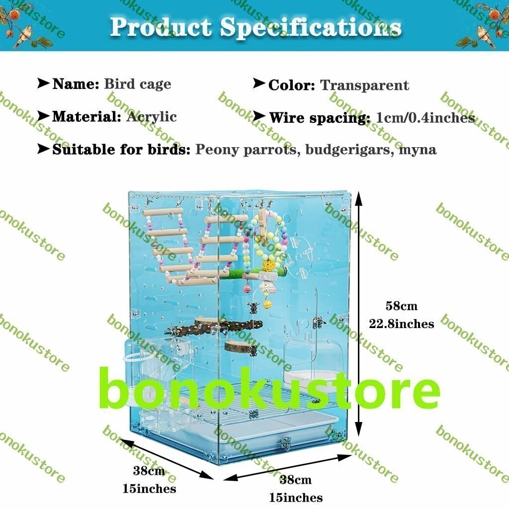 ??【製品仕様】:?名前:鳥かご / 鳥カゴ / 鳥ケージ / バードケージ / 鳥籠 / 鳥小屋 ?色:クリア?素材:アクリル?サイズ:38 * 38 * 58cm / 15 * 15*22.8インチ?ケージワイヤー間隔:1cm/0.4インチ?プレートの厚さ:0.4cm/0.15インチ?組み立てが必要かどうか:簡単な取り付け?鳥に適しています:牡丹オウム、バジリガー、マイナ、その他の小鳥?適用シーン:自宅、ペットショップ、バルコニー、動物病院、フラワーショップの装飾、休暇、旅行???【パッケージに含まれるもの】:?セット1:バードケージ* 1、スタンディングポール* 1?セット2:バードケージ* 1、スタンディングポール* 1、自動チャフセパレーションフードボックス* 1、飲用噴水* 1、20cmスタンディングポール* 1、20cmフロストスタンドポール* 1?セット3:バードケージ* 1、スタンディングポール* 1、自動チャフセパレーションフードボックス* 1、飲用噴水* 1、20cmスタンディングポール* 1、20cmフロストスタンドポール* 1、25cmとげのあるアッシュウッドポール* 1、噛むペンダント* 1、スイング* 1、ログプラットフォーム* 2、ラダー* 1、バスタブ* 1?【注意】1.バードケージのみを販売しており、その他は小道具です2.手動測定のため、1?3cmの差がありますのでご了承ください3.使用する撮影ツールが異なるため、わずかな色収差が発生する場合があります