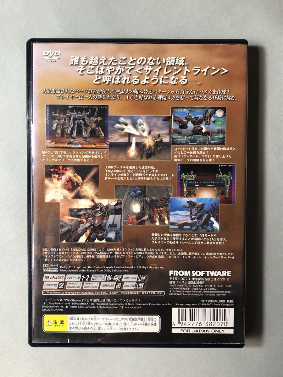 PS2ソフト ARMORED CORE 3 SILENT LINE「誰も超えたことのない領域。そこはやがてと呼ばれるようになる。」FROM SOFTWAREです。ケースに擦れ、細かな傷、線傷があります。ディスクのデータ読み取り面に擦れ、細かな傷や線傷があります。起動、動作確認済みです。写真のモノが全てです。新品をお探しの方や神経質な方の入札はご遠慮下さい。ノークレーム・ノーリターンで、お願いします。入札よろしくお願いいたします。 C06-427-102407