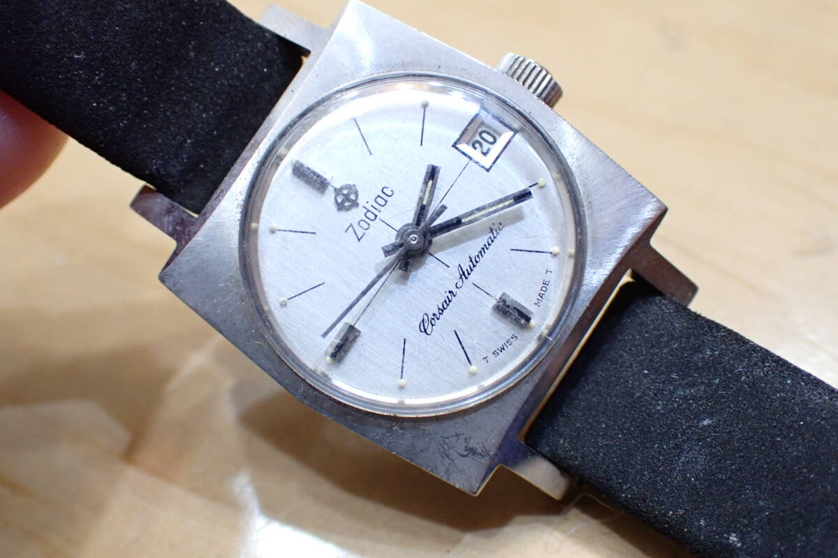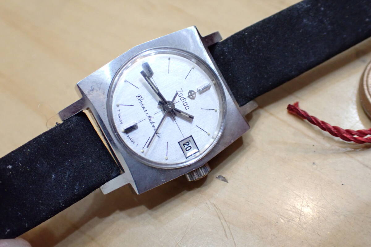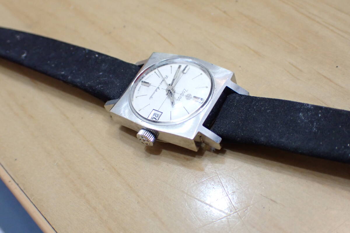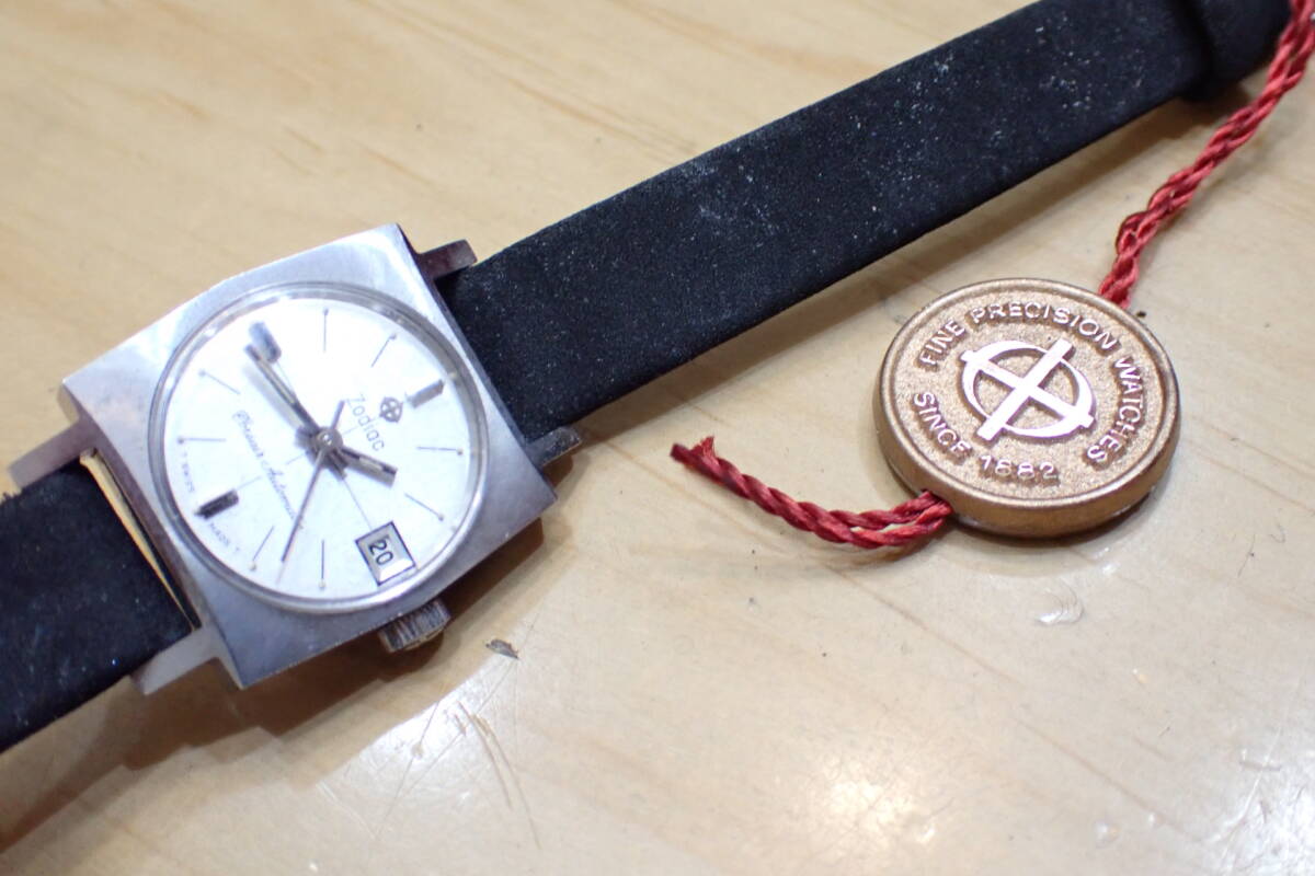 スイス製 ゾディアック/ZODIAC スクエアケース 自動巻き アンティーク 腕時計です。 時計店の在庫品で、タグ付きの未使用品です。 ケースは保管による小傷程度です。 風防は小傷あり、文字盤は綺麗です。 尾錠も純正です。 ベルトはオマケです。 ほか写真でご確認ください。 振って数分程度の確認ですがカチカチと動いています。 オーバーホール前提でジャンクでお願いします。 ケース径:約20mm ・他にいろいろ出品しています。 同封可能です。 !オークション終了後、24時間以内に「お取引を始める」ボタンをクリックして、必ず取引をスタートして下さい。 取引のスタートが無ければ、削除させていただきます。 必ず厳守してください! 「新規ID」「直近で悪い評価が多い方」のトラブル(イタズラなど)が非常に多いです。 当方が、お取引に支障があると判断したID(特に新規ID)は削除します。 ●ジャンク品と記載の物の商品到着時の動作保証はありません。 ●付属品等は、写真に写っているものですべてです。 | ||||