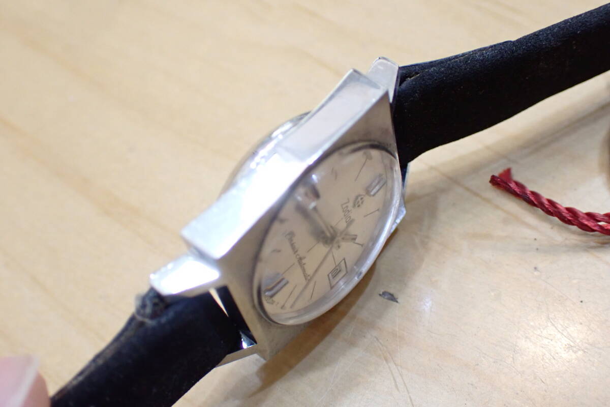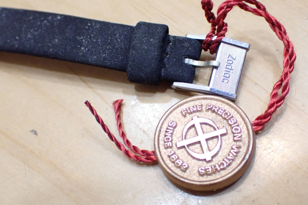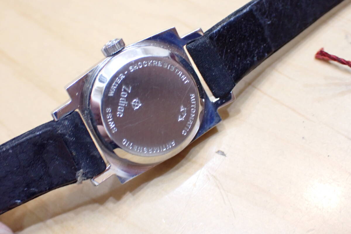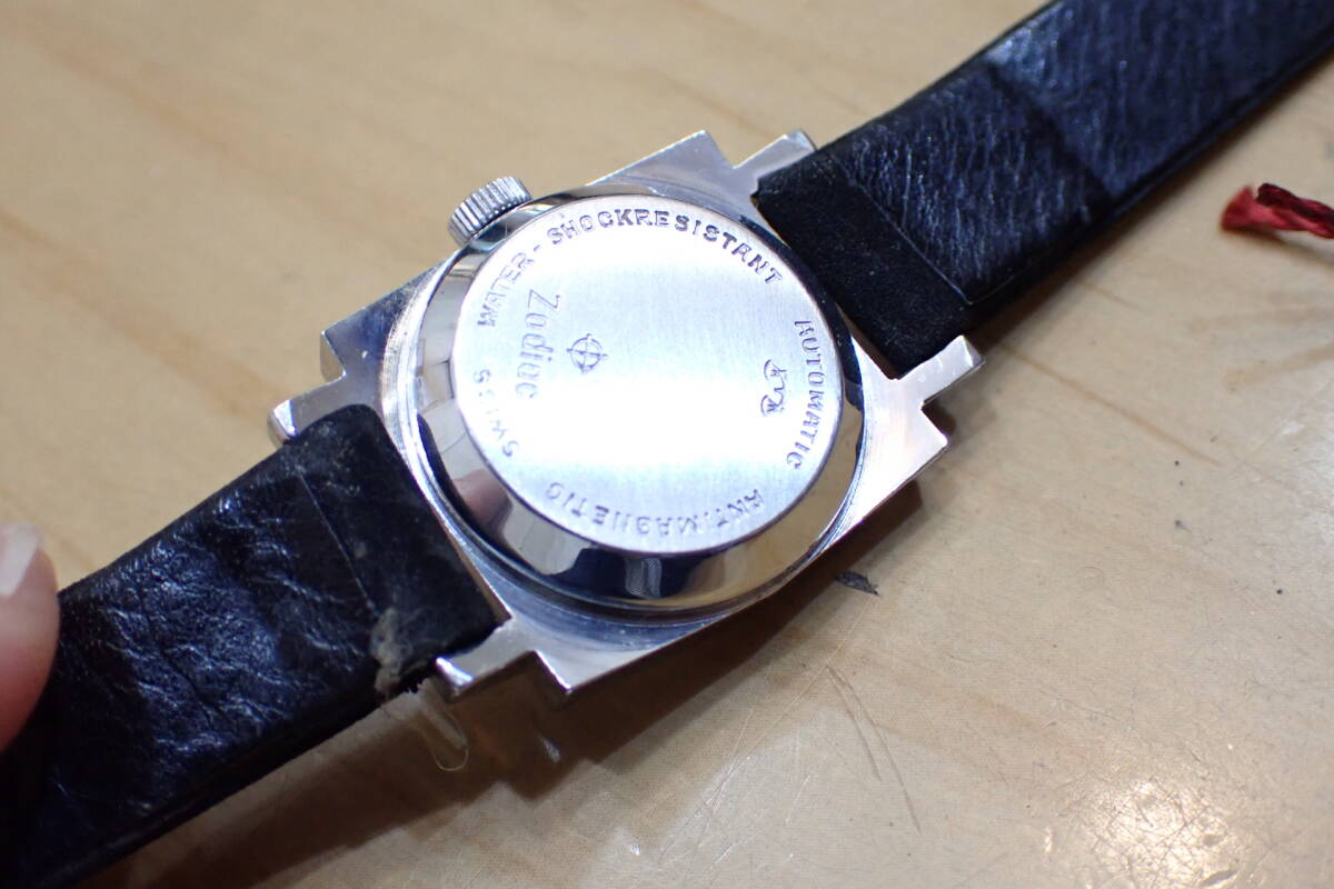 スイス製 ゾディアック/ZODIAC スクエアケース 自動巻き アンティーク 腕時計です。 時計店の在庫品で、タグ付きの未使用品です。 ケースは保管による小傷程度です。 風防は小傷あり、文字盤は綺麗です。 尾錠も純正です。 ベルトはオマケです。 ほか写真でご確認ください。 振って数分程度の確認ですがカチカチと動いています。 オーバーホール前提でジャンクでお願いします。 ケース径:約20mm ・他にいろいろ出品しています。 同封可能です。 !オークション終了後、24時間以内に「お取引を始める」ボタンをクリックして、必ず取引をスタートして下さい。 取引のスタートが無ければ、削除させていただきます。 必ず厳守してください! 「新規ID」「直近で悪い評価が多い方」のトラブル(イタズラなど)が非常に多いです。 当方が、お取引に支障があると判断したID(特に新規ID)は削除します。 ●ジャンク品と記載の物の商品到着時の動作保証はありません。 ●付属品等は、写真に写っているものですべてです。 | ||||
