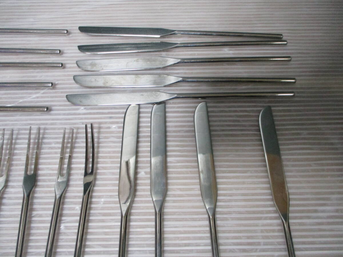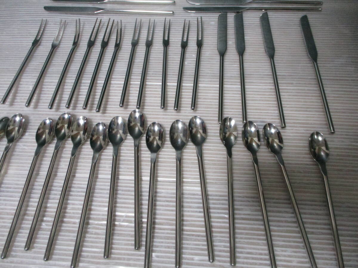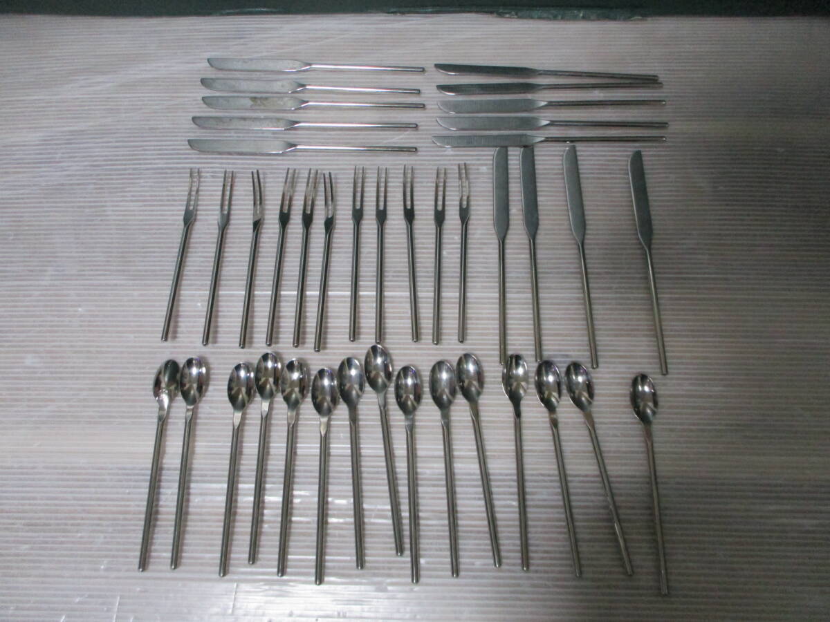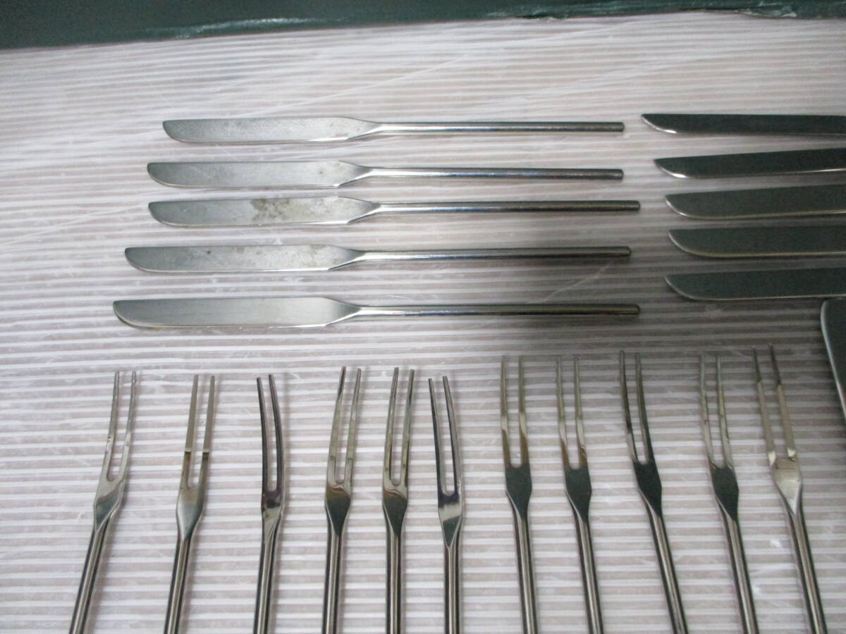 写真の状態。特に傷みはない。使用品。くすみあり。洗って使いください。スプーンとナイフが14本ずつ。フォークが11本ある。