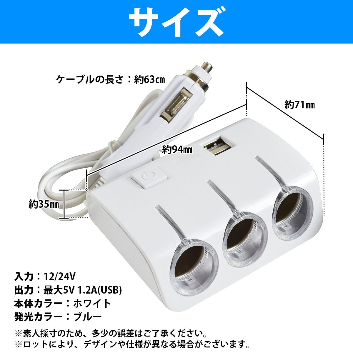『ON/OFFスイッチ付き』LED シガーソケット USB+3連 電源 延長コード 12V/24V 白 電源 シガソケ