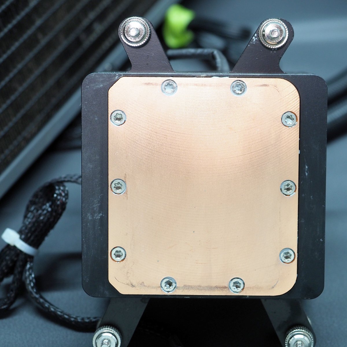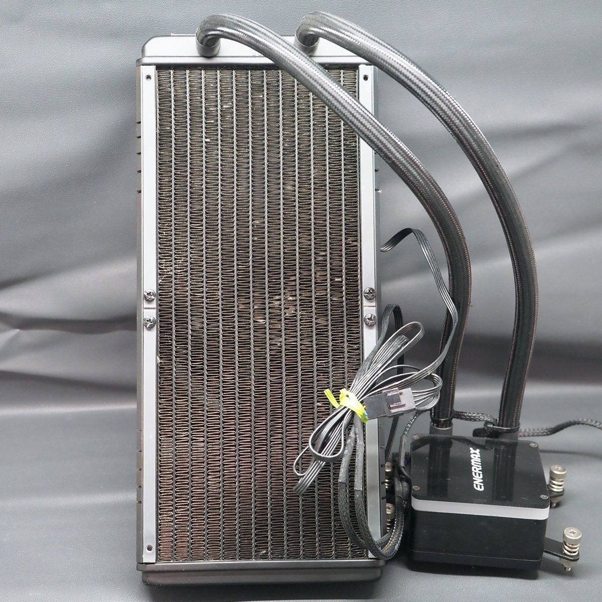 ■CPUクーラー:ENERMAX 簡易水冷 型番不明。14cmファン2基が搭載されており、ファンは改装されているようです。※グリスは拭き取っております。