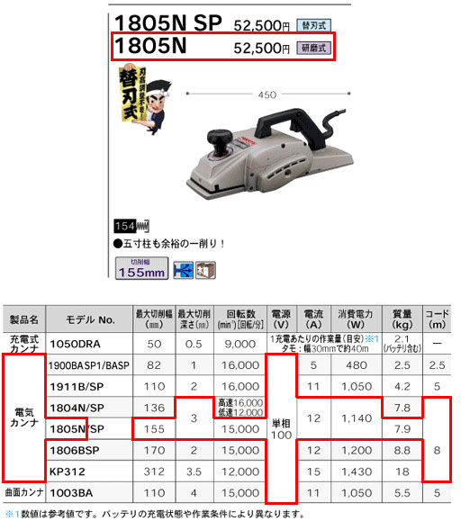 マキタ 155mm電気カンナ 1805N を出品いたします。 ■特徴■ 五寸柱も余裕の一削り! 切削幅155mm 単相100V、替刃式 ■仕様■