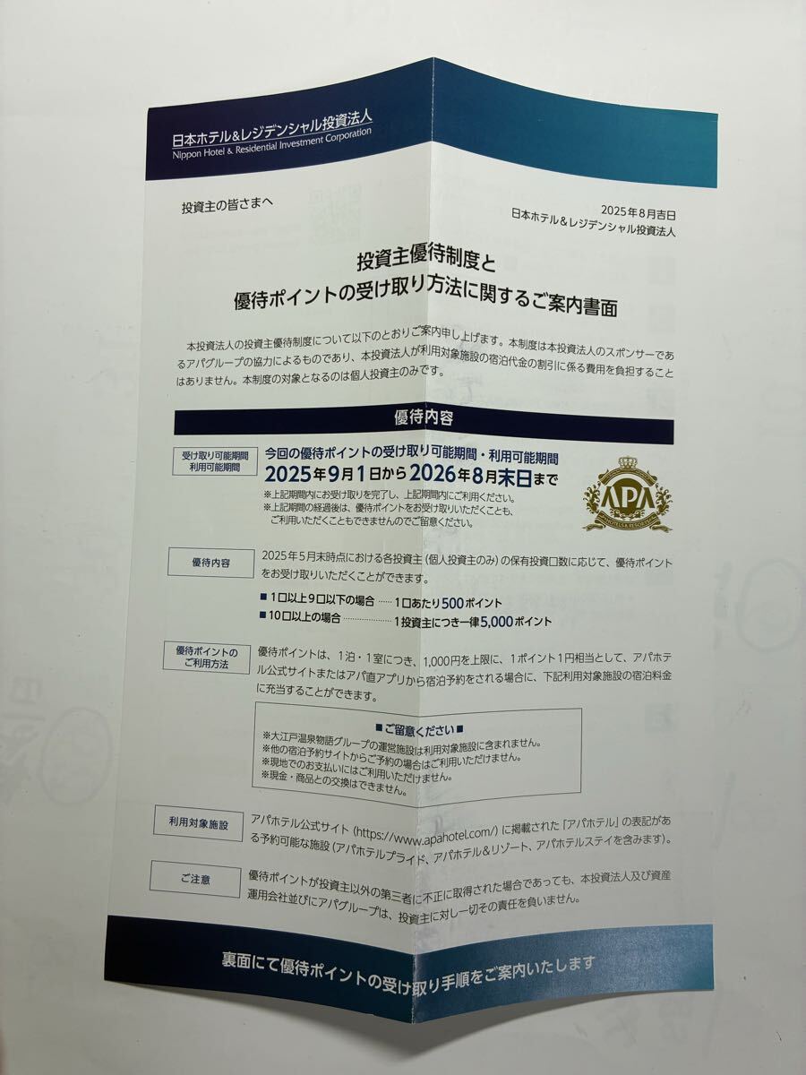 商品説明【2026/8/31まで】5000ポイント 日本ホテル&レジデンシャル投資法人 株主優待 全国のアパホテルで使用可