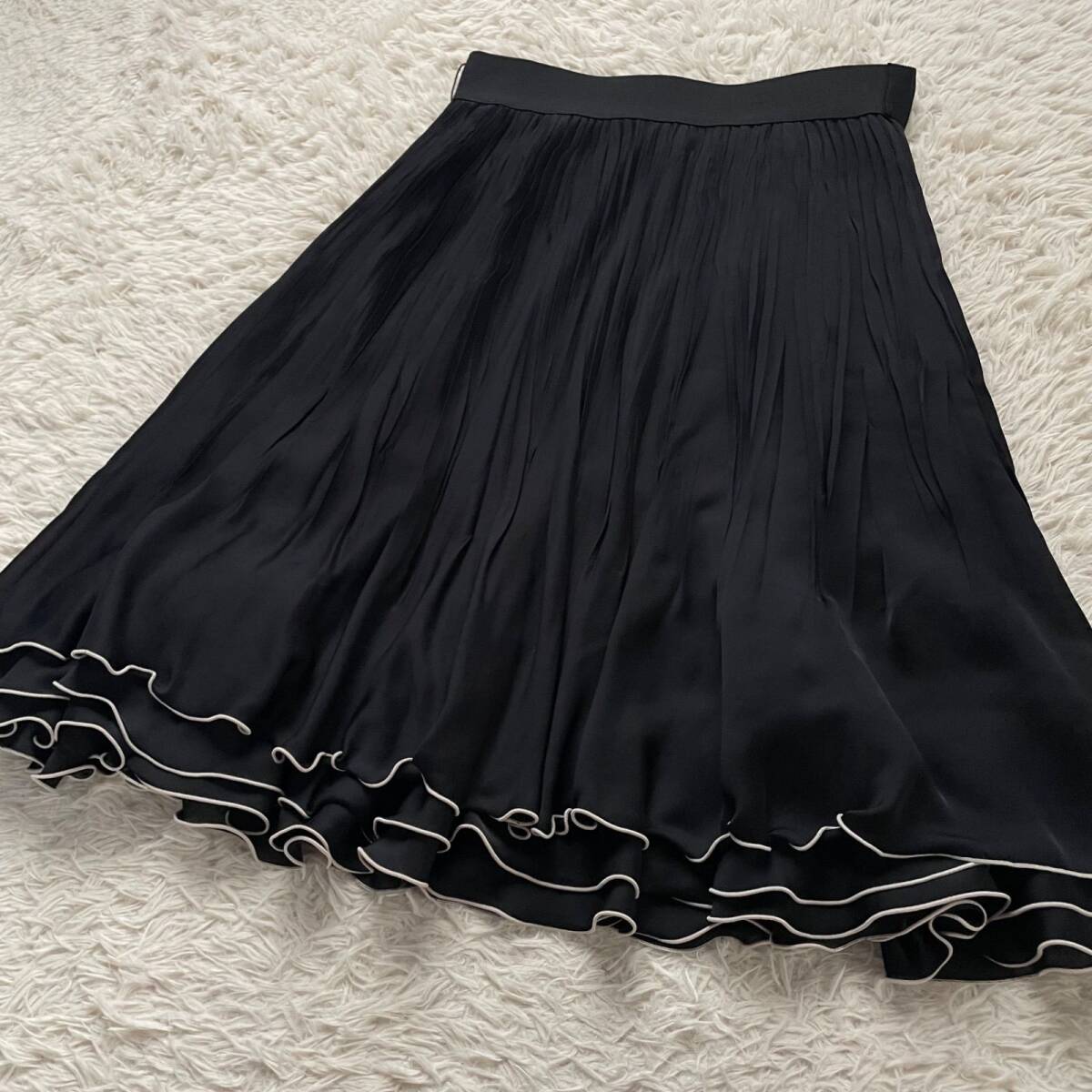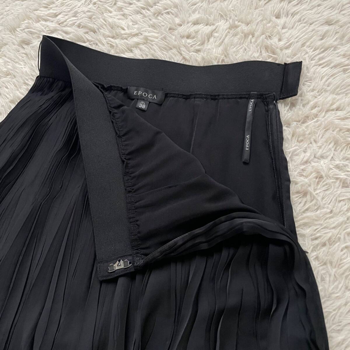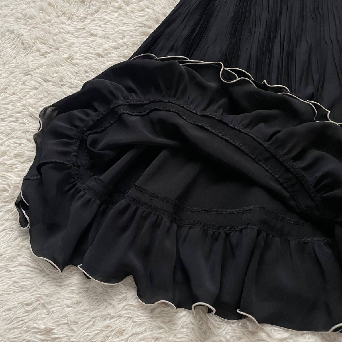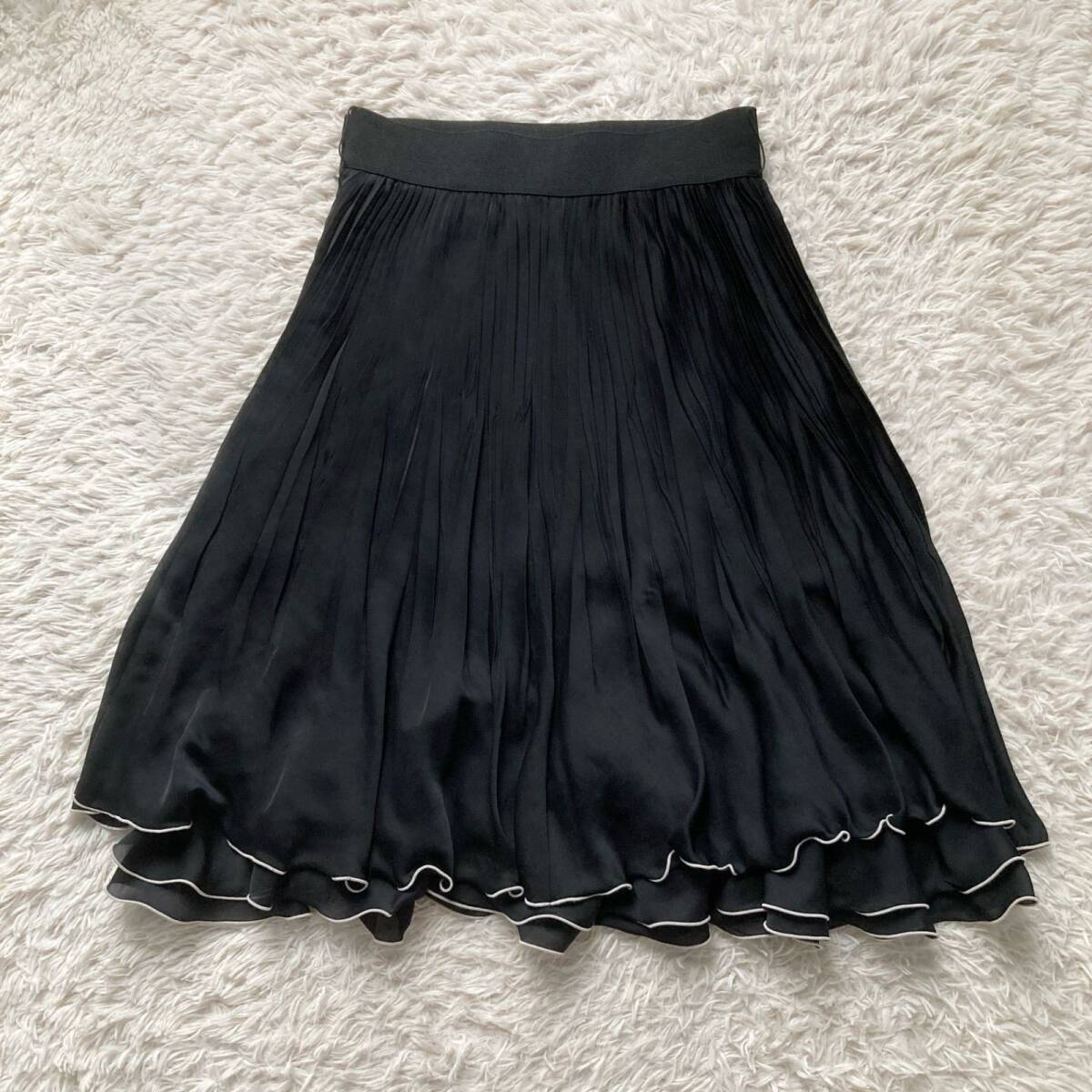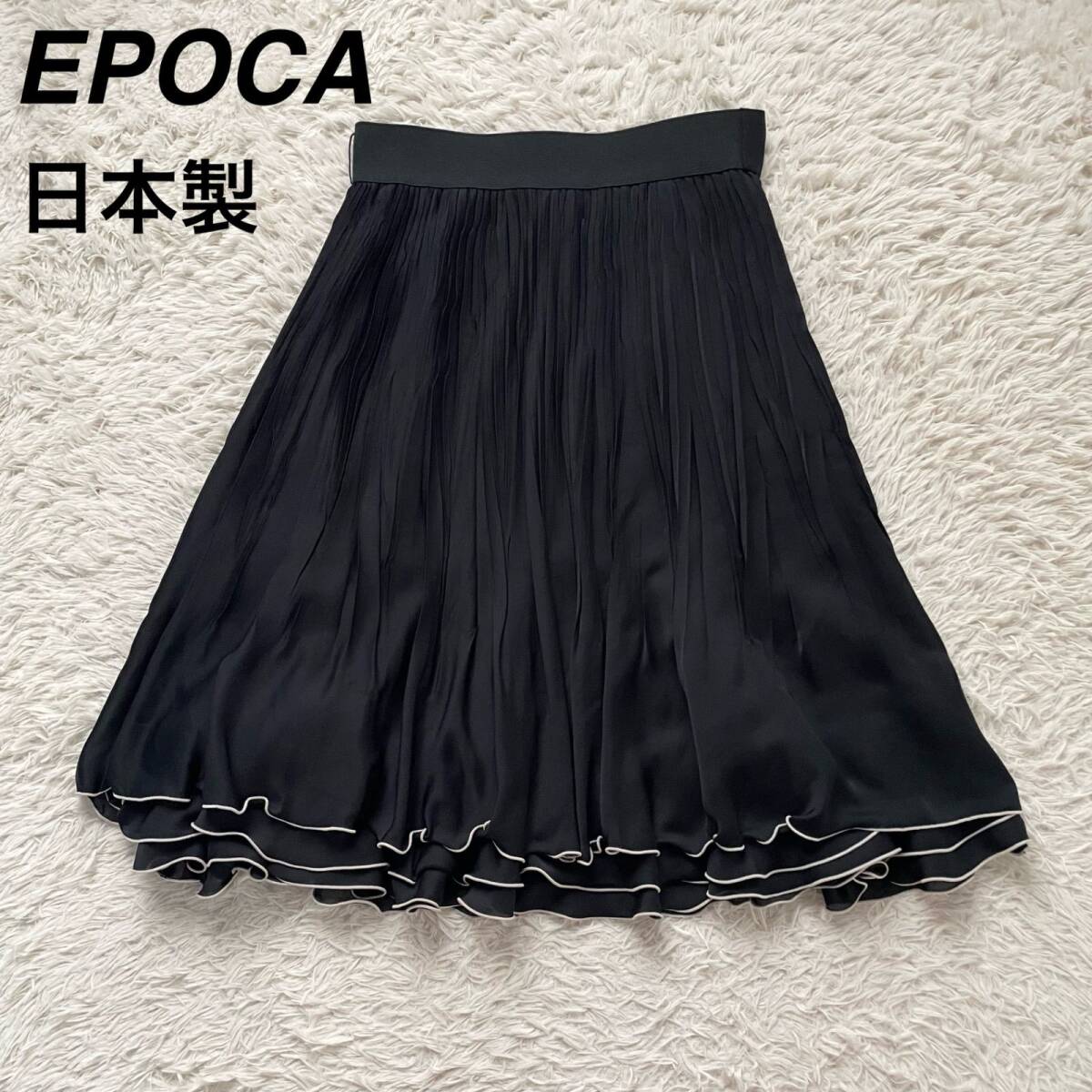 EPOCA(エポカ)の美シルエットプリーツスカート。歩くたびに軽やかに揺れるアコーディオンプリーツと、裾のティアードフリルデザインが最大の魅力です。エレガントな黒で、オフィスから特別なデート、お食事会まで幅広く活躍します。日本製の上質ポリエステル素材で、手洗い可能(要ネット使用)な点も嬉しいポイント!