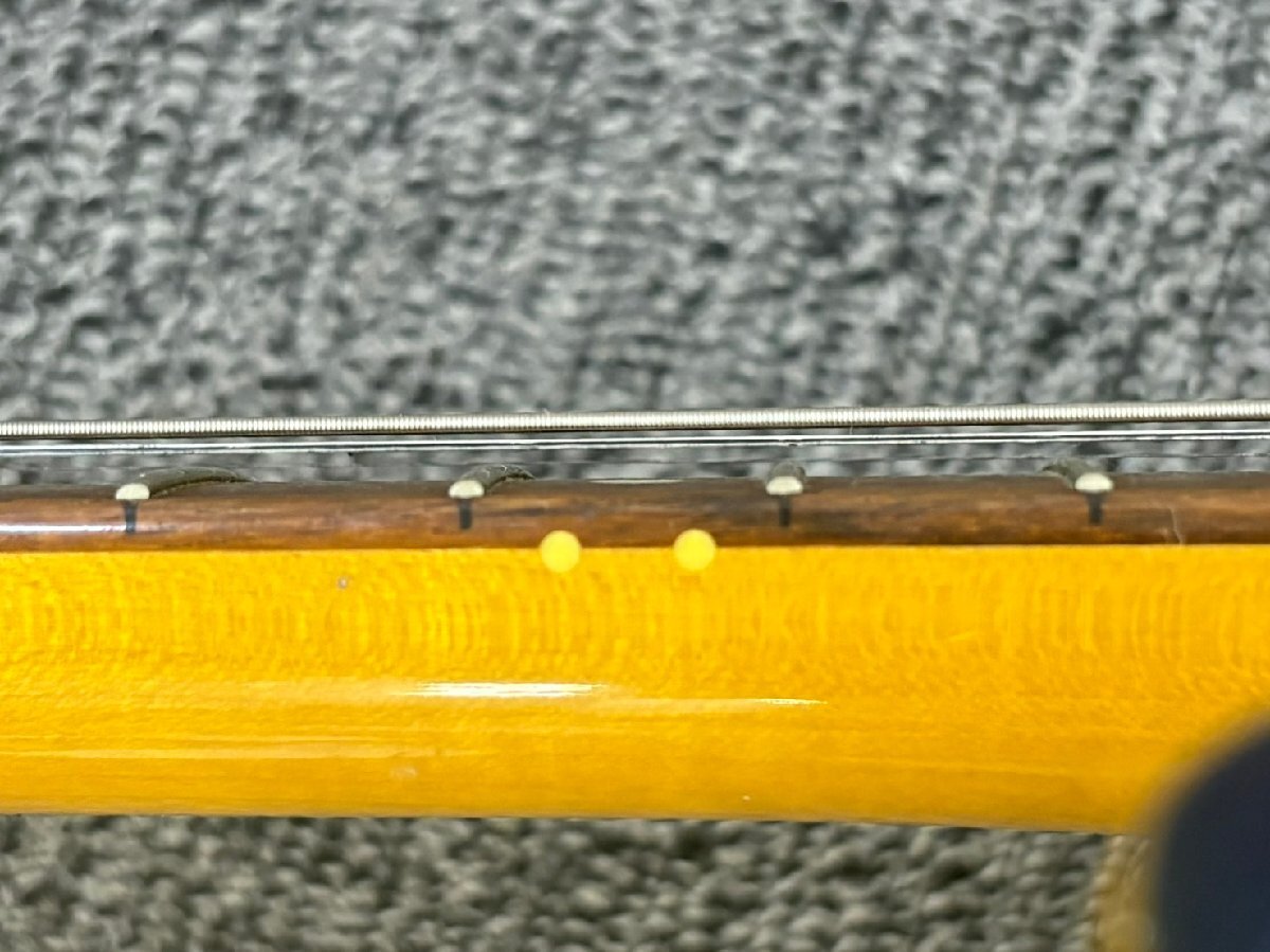 | ◆外観◆ ・★キズ、汚れ、使用感があります。 ・★ボディ:傷・汚れ・スレ・バックパネルに割れ・ネック根本付近に塗装割れがあります。 ・★ネック:傷・汚れ・スレがあります。 ・★ヘッド:傷・スレ・打痕があります。 ・★金具:くすみがあります。 ・★ブリッジ、ペグ、ナットが交換されているものと思われます。 |