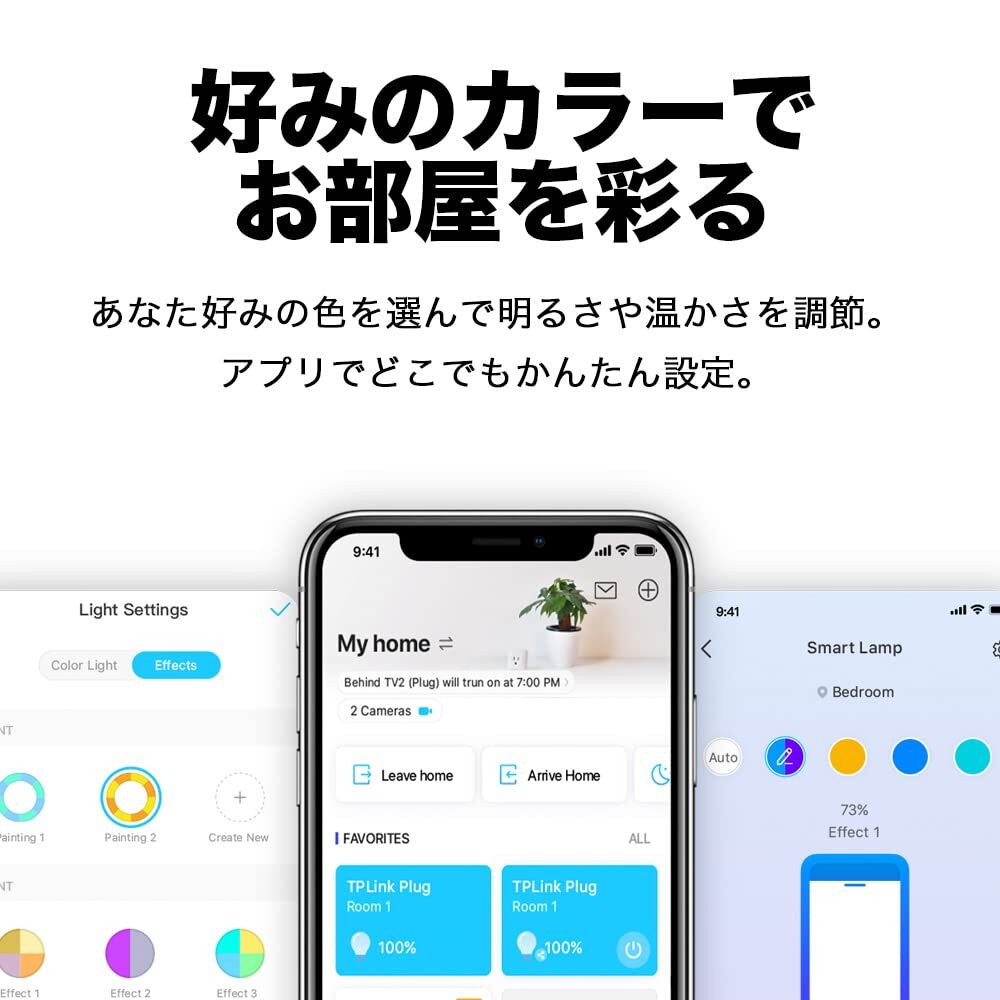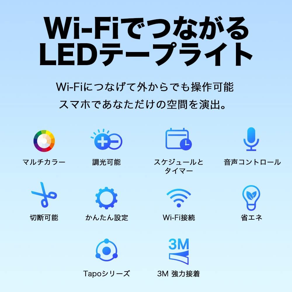 使い方はあなた次第:Tapoアプリだけでなく、普段から使用しているスマートアシスタントと連携させて自由にコントロールすることができます。くつろぎタイムを:自分の好きな雰囲気を作り出して、リラックスした時間を過ごしましょう。音声コントロール:Googleアシスタントや Alexaに対応しているので手放しでも操作可能です。ハブは不要:WiFi経由で接続できるので、専用のハブや機器を別途用意する必要はありません。自由に取り付け:必要な長さにカットしたら、シールを剥がして貼るだけでかんたんに設置できます。便利なプリセット:映画鑑賞や食事にぴったりな設定を見つけて保存しておけば、お部屋の雰囲気をすぐに切り替えて楽しめます。スケジュール&タイマー:お好みの色/明るさで、お好みの時間にオン/オフが設定可能です。おでかけモード:オン/オフを無作為に切り替えて、家主の不在を悟られないようにします。