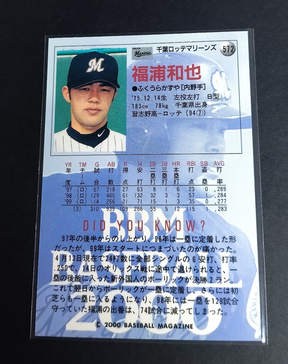 2000年BBM 福浦和也(ロッテ)No,572。ハイナンバー。