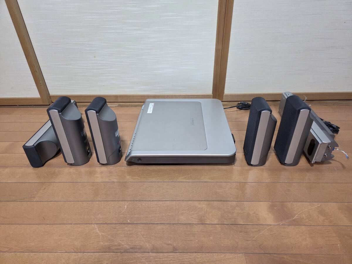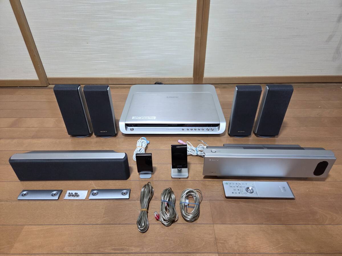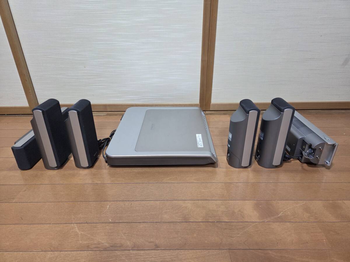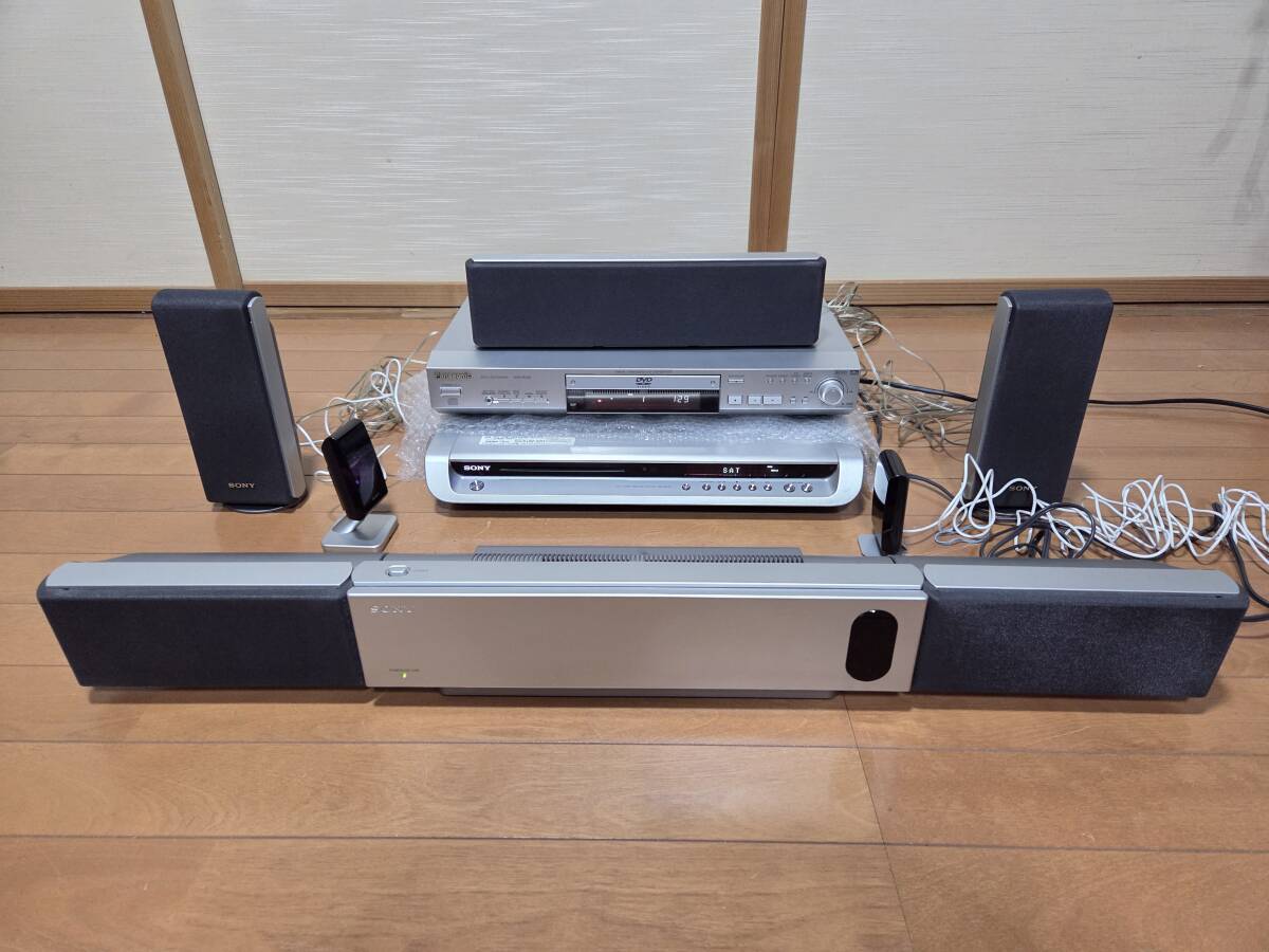 ソニーのdvdホームシアターシステム、アンプ部dav-sr1w。フロントスピーカー部ss-ts20、2個。サラウンドスピーカー部ss-ts23、2個。サラウンドアンプ部、ta-sr1wr。センタースピーカー、ss-ct44、1つ。リモコンrm-sp320j。赤外線システムdir-r2、dir-t1。です。本体のdvdは再生しません。画像の様にcdによるrca、光入力による音出し確認しました。アンプ部本体のボタンが反応しません。リモコンでの操作になります。ナイトモード、モード、で音が変化する事を確認しました。禁煙環境で使用していました。超多機能なので他は一切確認していません。中身を入れ替えてクレームを言われる方が居ます、ノークレームノーリターンノーサポートです。