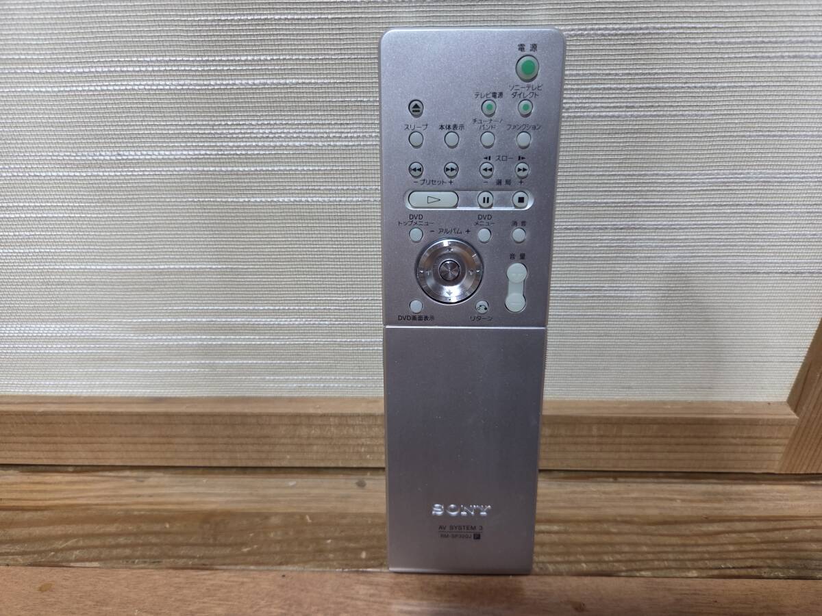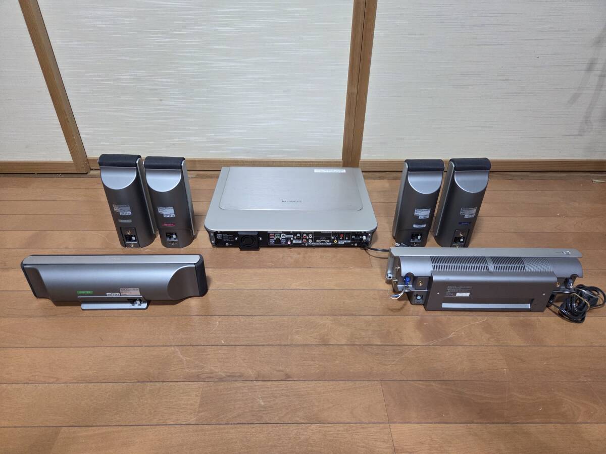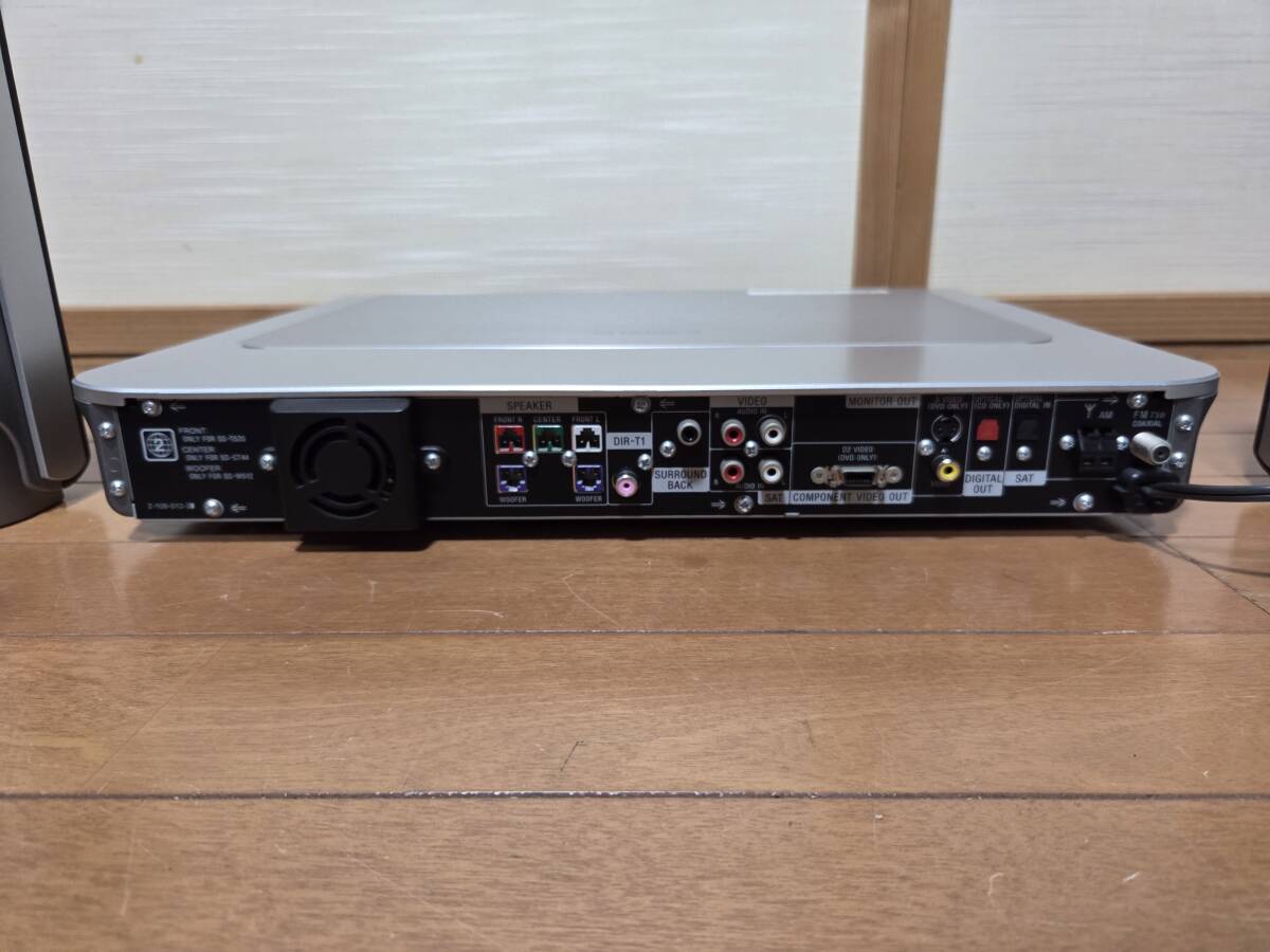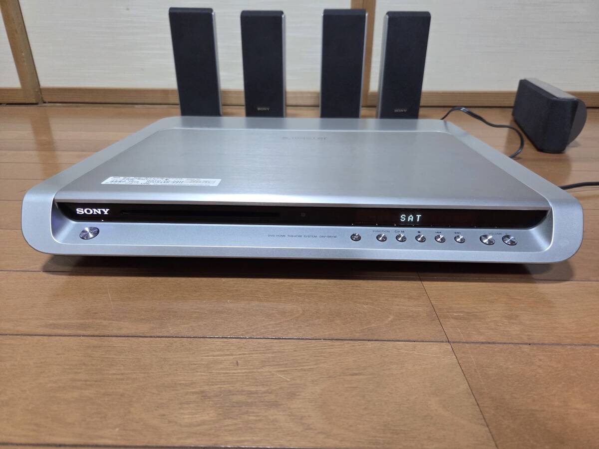 ソニーのdvdホームシアターシステム、アンプ部dav-sr1w。フロントスピーカー部ss-ts20、2個。サラウンドスピーカー部ss-ts23、2個。サラウンドアンプ部、ta-sr1wr。センタースピーカー、ss-ct44、1つ。リモコンrm-sp320j。赤外線システムdir-r2、dir-t1。です。本体のdvdは再生しません。画像の様にcdによるrca、光入力による音出し確認しました。アンプ部本体のボタンが反応しません。リモコンでの操作になります。ナイトモード、モード、で音が変化する事を確認しました。禁煙環境で使用していました。超多機能なので他は一切確認していません。中身を入れ替えてクレームを言われる方が居ます、ノークレームノーリターンノーサポートです。