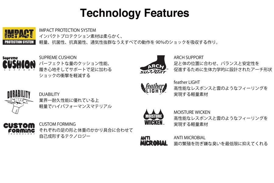 これらを実現する事で、アクションスポーツを長く楽しむ為に一番大事な足を守るために開発された優れたインソールです。
