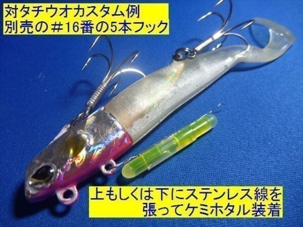 | 商品説明 | どの方向から食ってきても針ガガリ◎です。 写真の使用例は対太刀魚用です。 タコテンヤ、イカエギ、フグ、カワハギ、ボラ、タチウオテンヤ等の改造自作用としてお使いください。 サゴシ多発地帯でのアオリイカノマセ仕掛けなど、 アイディア次第で使い方はいろいろです。 青物とイカの混在地帯でのノマセ(生きアジなどを利用)をやる場合にイカと青物両対応の仕掛けを作るときに便利です。 |
