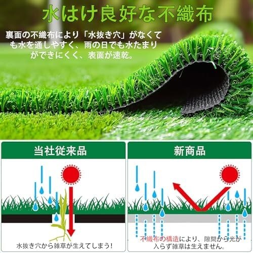 雑草を抑える高機能構造:本芝生は、防草シート層を含む独自の四層構造を採用。一般的な三層構造とは異なり、より高い防草性と安定性を実現しています。裏面には専用の粘着層を施し、芝糸をしっかりと固定することで、使用中の抜け落ちを防止。さらに、99.51%以上の遮光率により、雑草の光合成を妨げて発芽と成長を効果的に抑えます、お庭やベランダを清潔で美しい状態に保てます。
