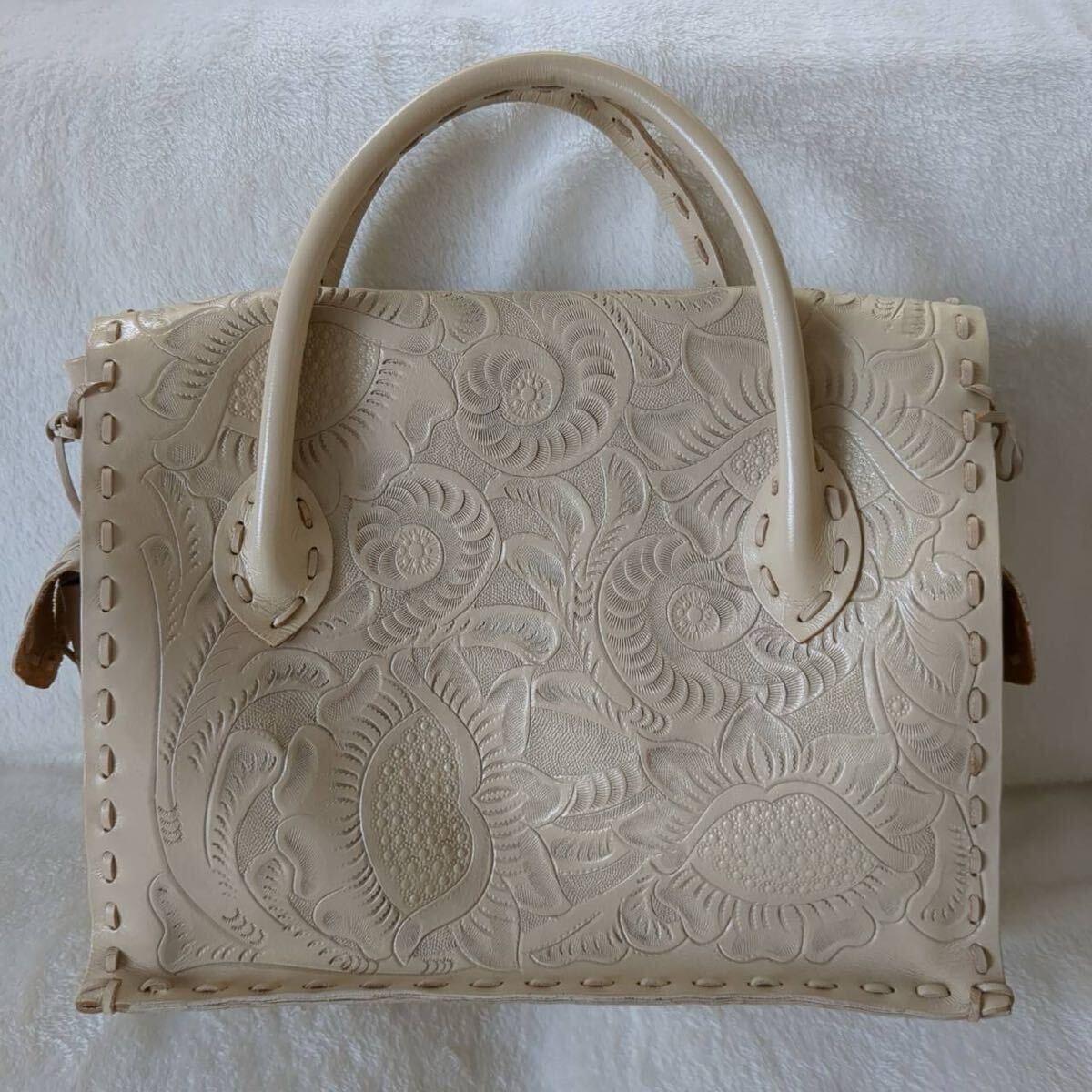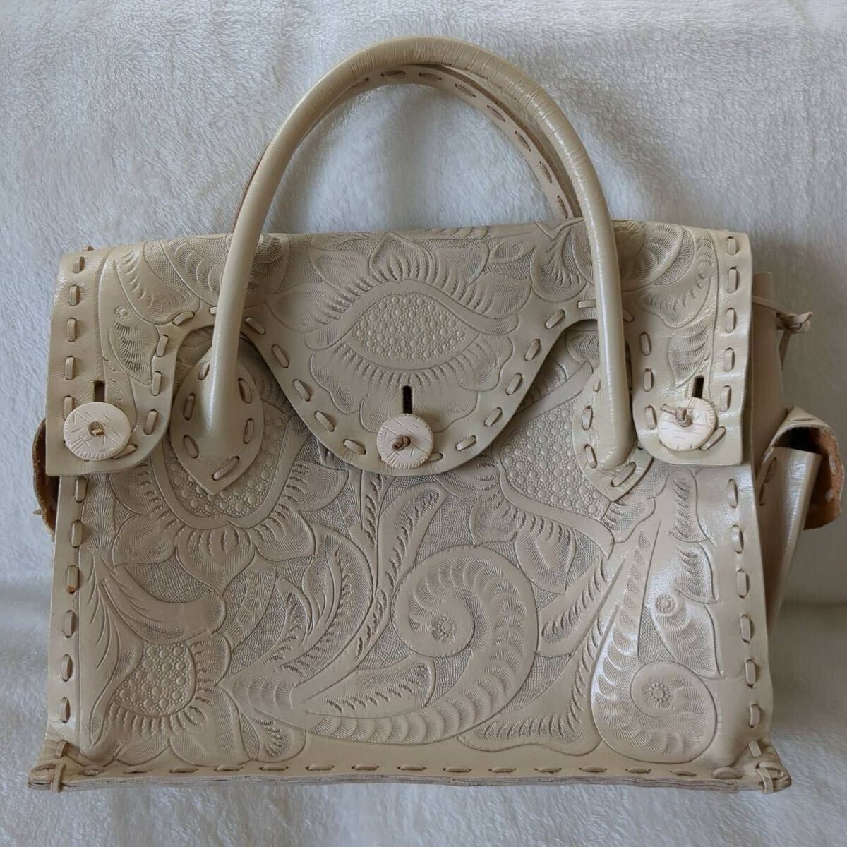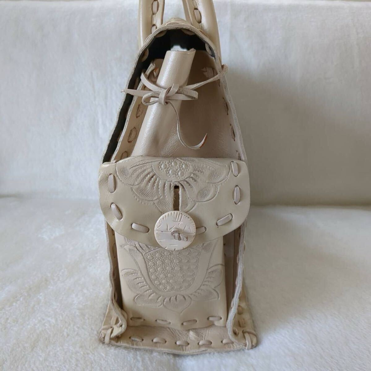 レディース ハンドバッグ トートバッグ 手彫り柄 手彫り鞄 牛革 レザー カーフレザー 型押し 総柄 花柄 彫刻 ボタニカル フラワー モチーフ 美品 Lサイズ ピンクベージュ 柄 デザイン 花柄