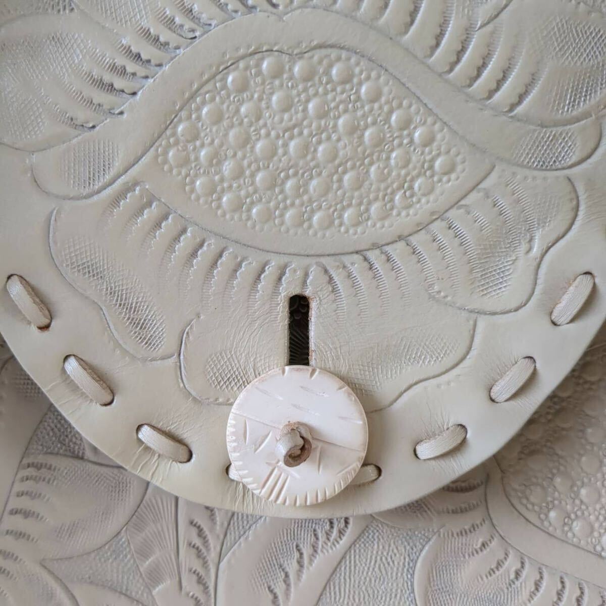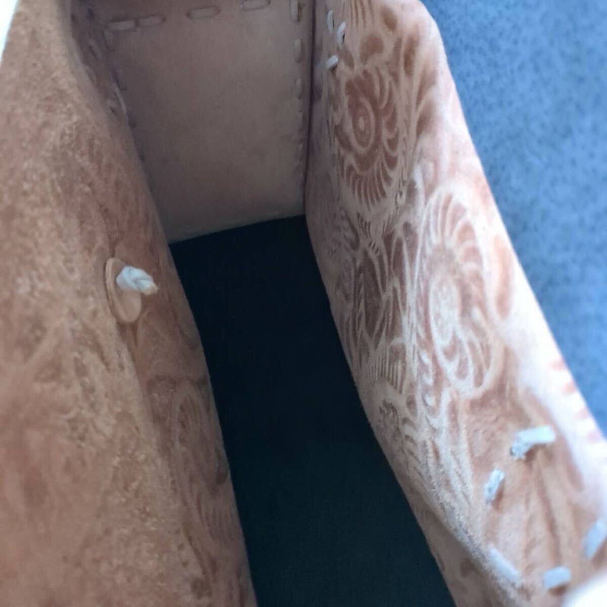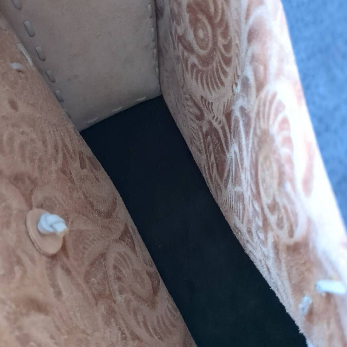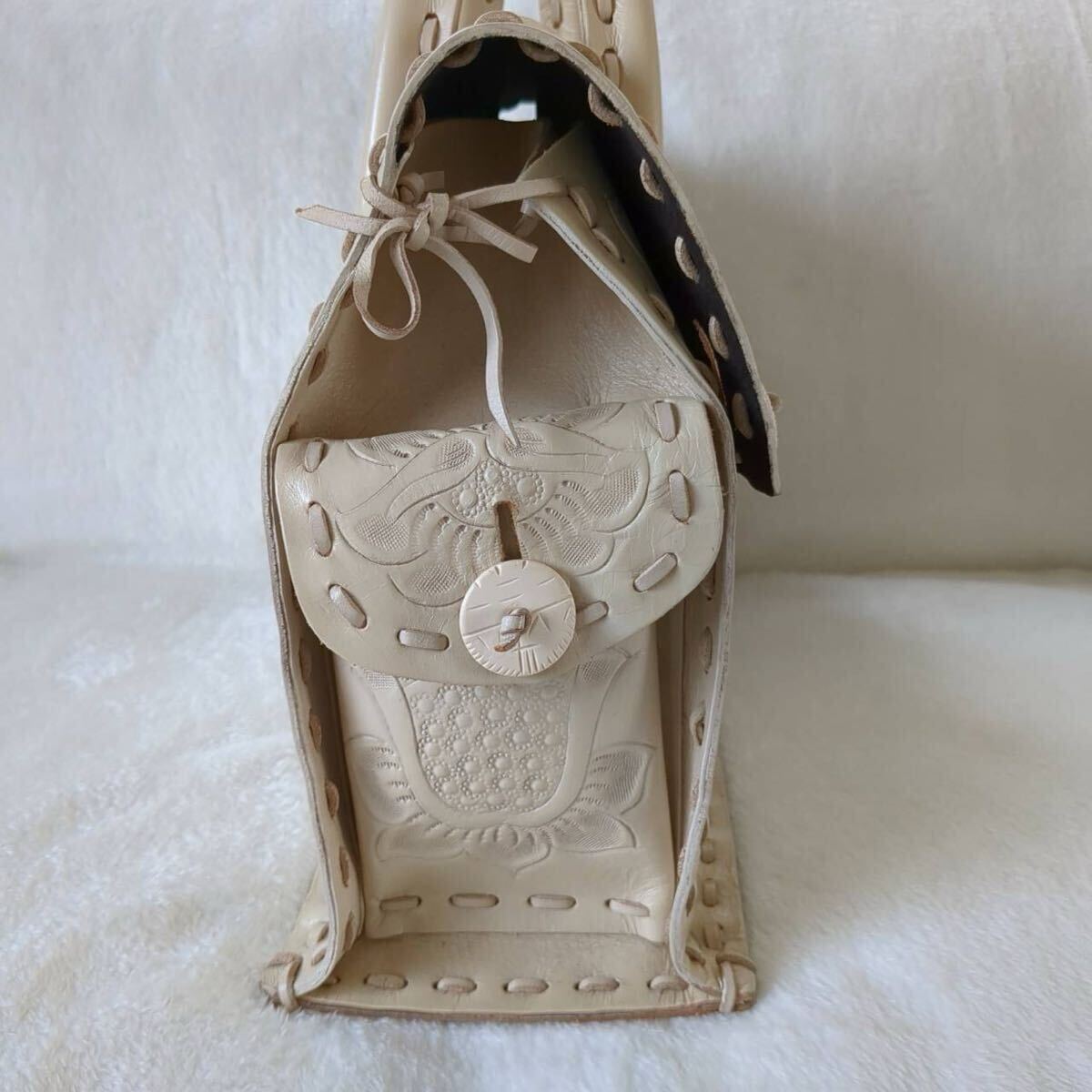 レディース ハンドバッグ トートバッグ 手彫り柄 手彫り鞄 牛革 レザー カーフレザー 型押し 総柄 花柄 彫刻 ボタニカル フラワー モチーフ 美品 Lサイズ ピンクベージュ 柄 デザイン 花柄