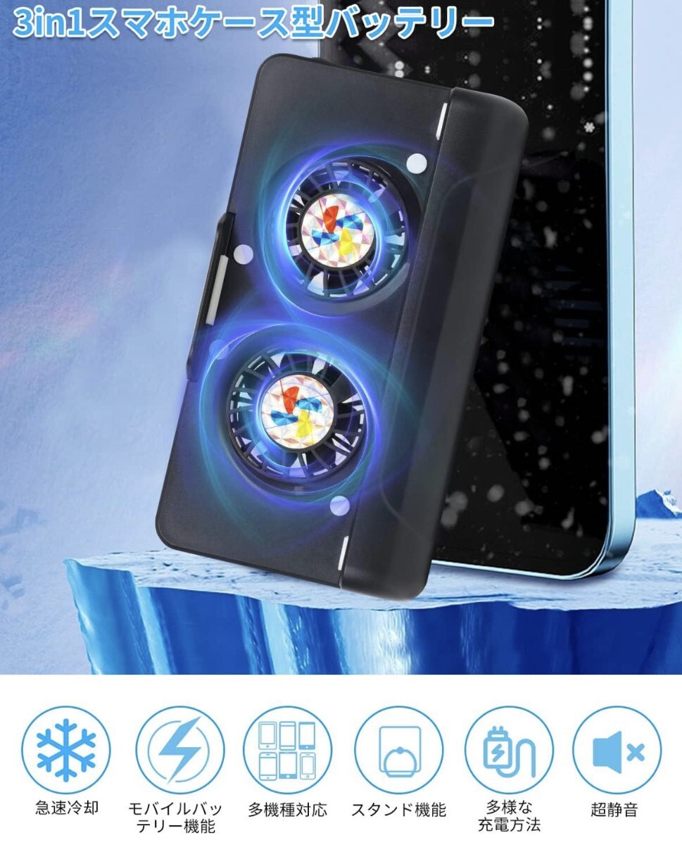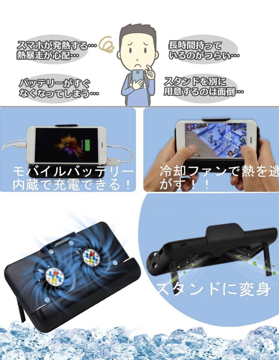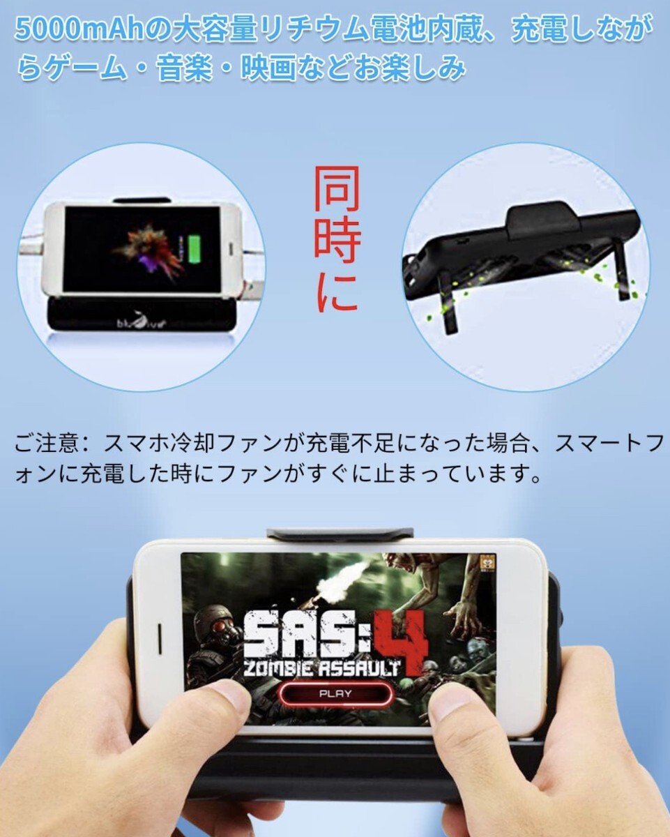 【生放送のために生まれるとスタンド機能】5000mAhの大容量電池内蔵、7-15時間に使用する可能です。充電しながらゲーム・音楽・映画などお楽しみ頂けます。ご注意: スマホ冷却ファンが充電不足になった場合、スマートフォンに充電した時にファンがすぐに止まっています。