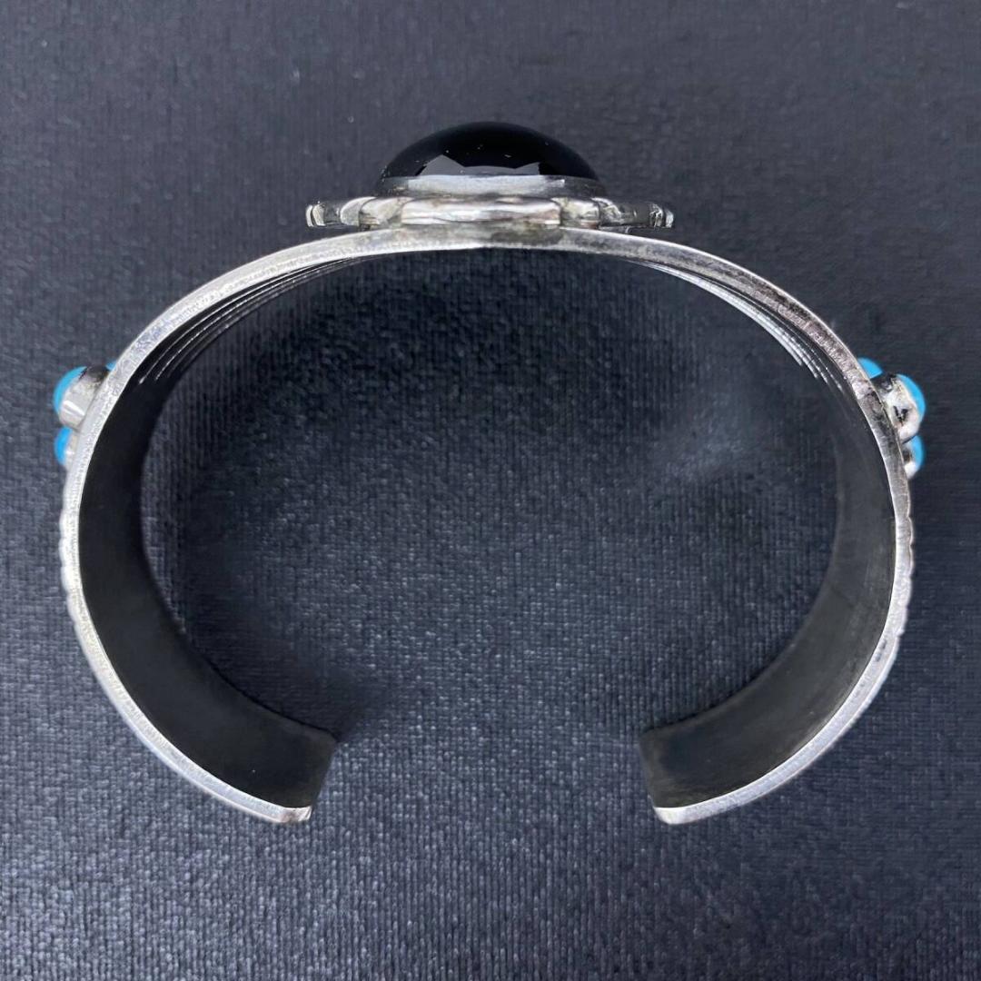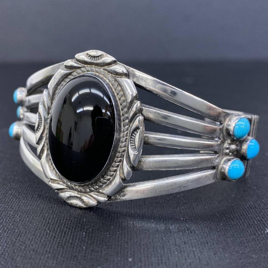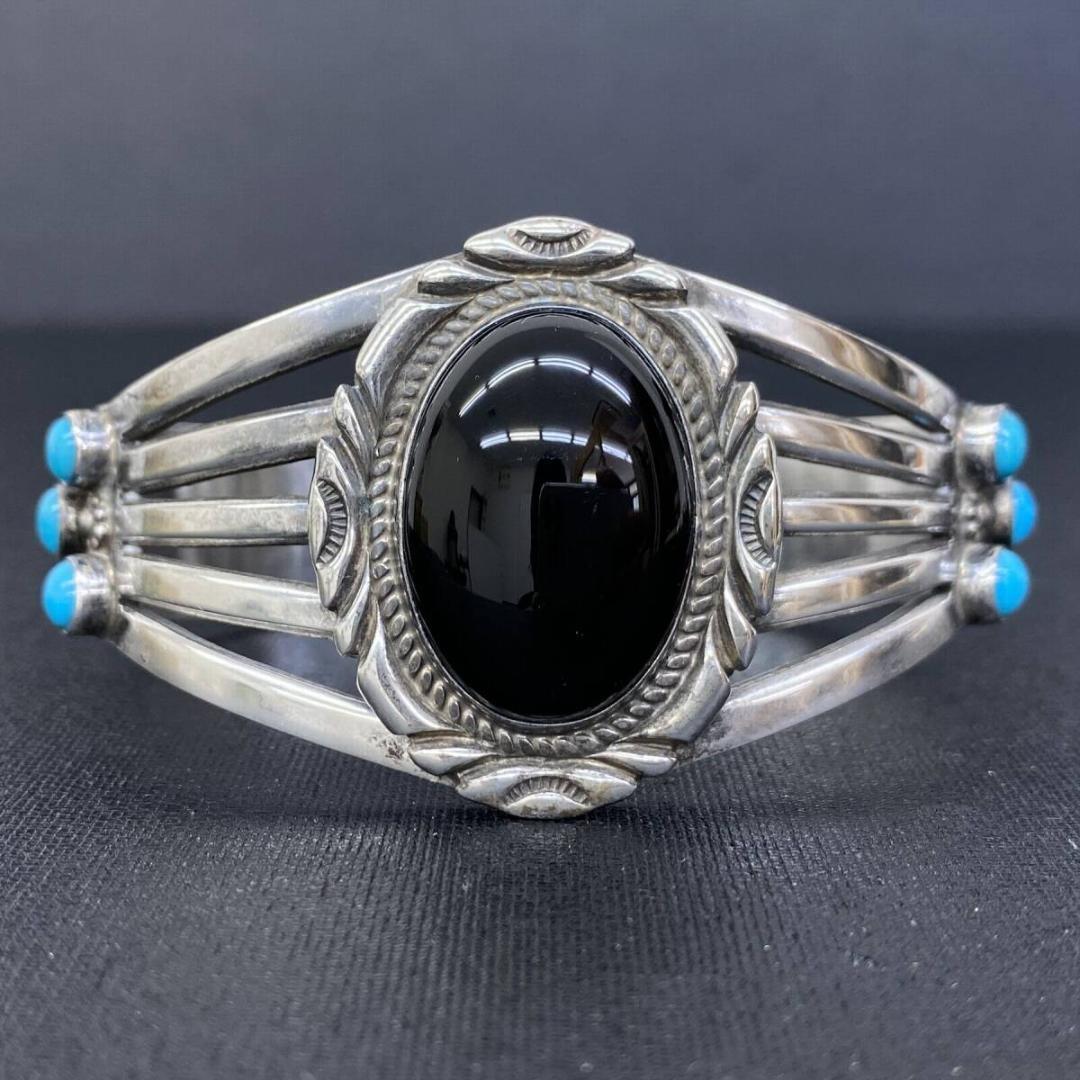 NAVAJO ナバホ族 J.Linkin シルバー オニキス ターコイズ ストーン ネイティブ スタンプワーク ワイヤー デザイン バングル ブレスレット
