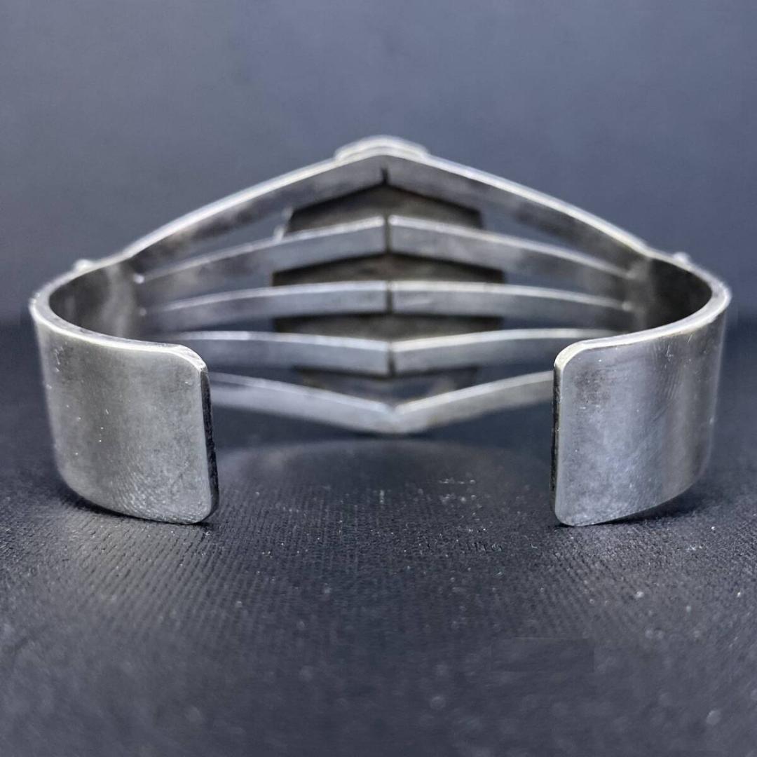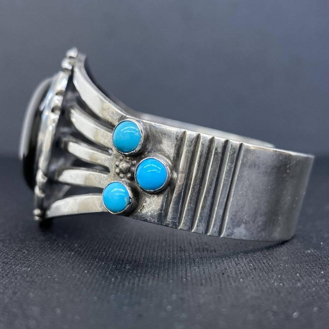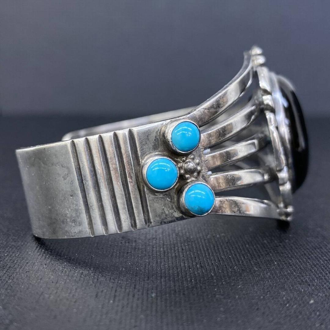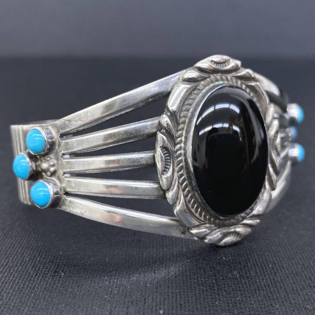 NAVAJO ナバホ族 J.Linkin シルバー オニキス ターコイズ ストーン ネイティブ スタンプワーク ワイヤー デザイン バングル ブレスレット