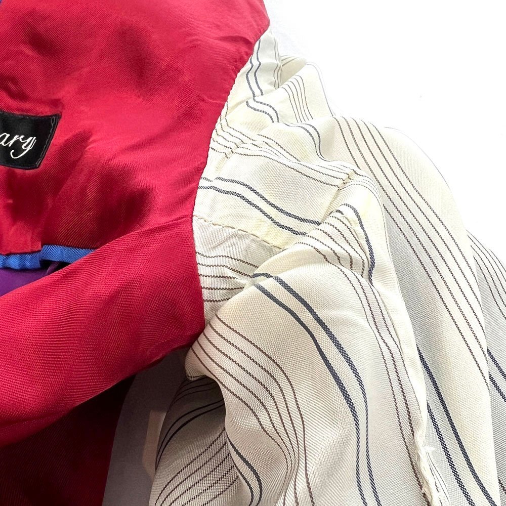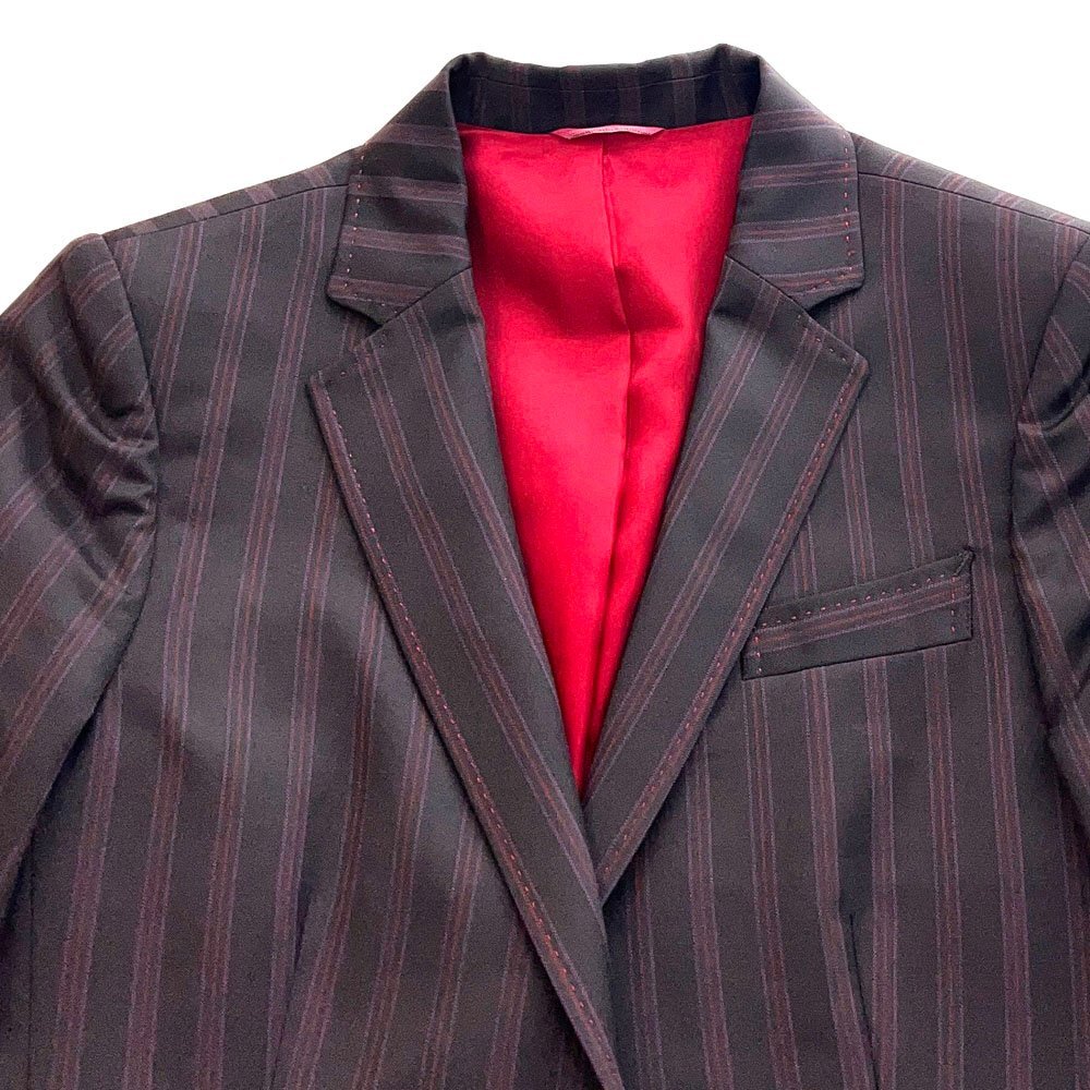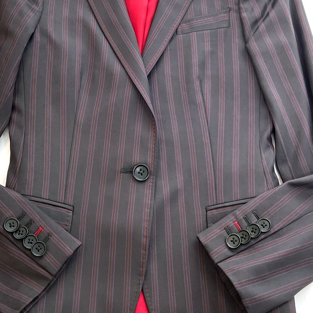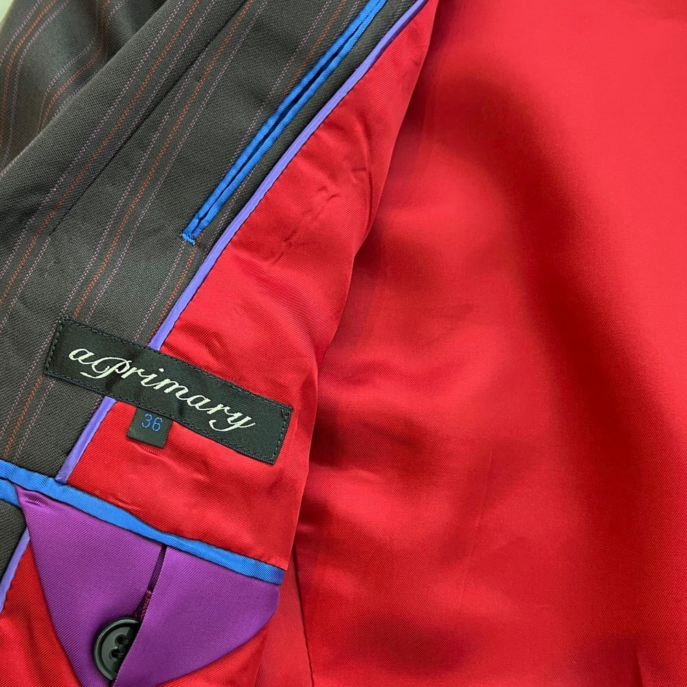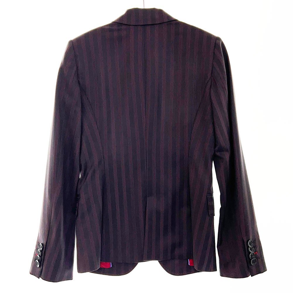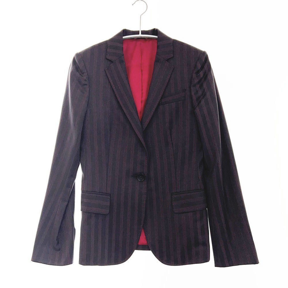 | コメント | アプライマリーはデザイナー小川章子氏が手掛けるレディースブランドです。 ストライプ柄のテーラードジャケットです。グレーの生地にパープルとレッドのストライプ柄、ステッチも赤となっています。フロントボタン×1、フロントポケット×3、総裏地付き、肩パッド付き、内側ポケット×2です。イタリア製の生地を使用、高級感のあるお品です。管理番号94175のスラックスとセットアップで着用いただけます(販売済の場合はご容赦ください)。 USEDのお品です。両脇の裏地にシミがございます(写真5)。使用感はほとんどなく表地はキレイです。ご理解のある方の入札をお待ちしております。 |