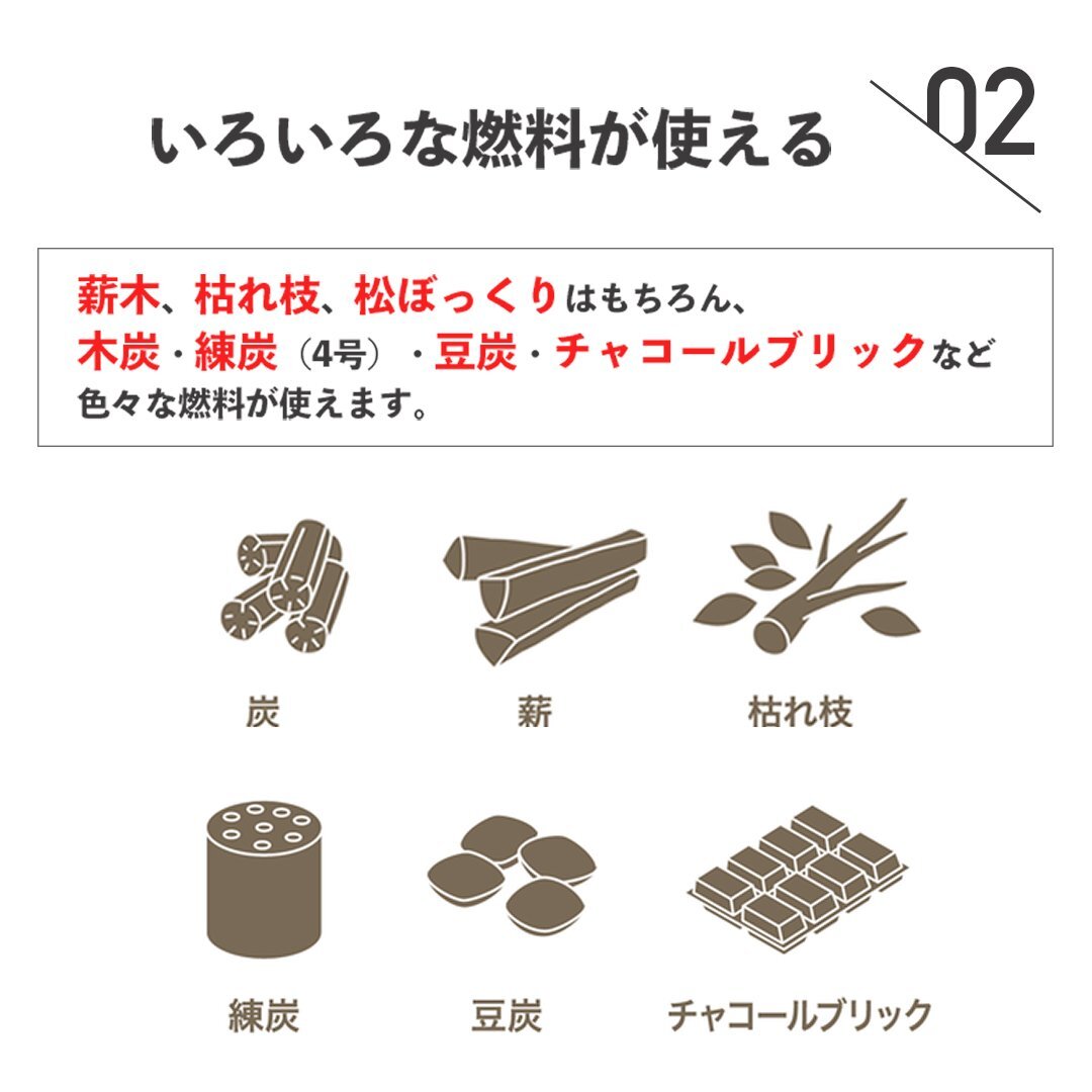 ・木炭や薪以外にも練炭や豆炭、枯れ枝や落ち葉などいろいろな燃料が使えて