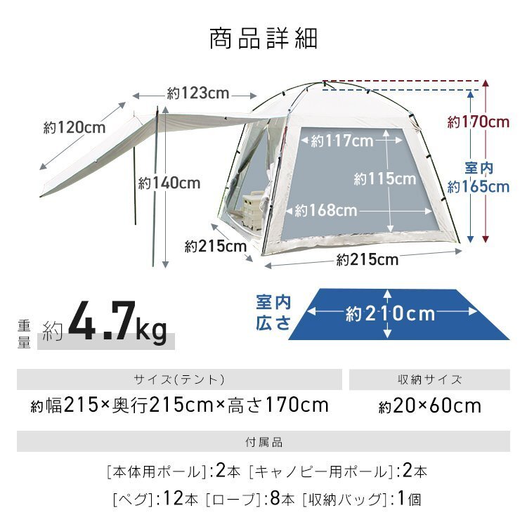 | 約3~4人で使えるキャノピー型テントです! テント内はゆったりくつろげる広々サイズです。 サンシェードのように日差しから守ったり、 空間を拡張したりと、シーンに合わせた空間づくりができます。 完全フルクローズ仕様!雨風や視線を防ぎます。 また、全面メッシュスクリーンで虫を防ぎつつ、風を通し快適な空間を守ります! UPF50+のUVカット生地を採用! テント内部はシルバーコーティングを施し、暑さ軽減!! 耐水性能&シームテープ加工で突然の雨でも安心です。 収納バッグ付でコンパクトサイズに!持ち運びもしやすいです♪ 細部までこだわり、地震や災害時の防災用品としても使えます! ■商品コード:ODTT18SB ■商品仕様 重量:(約)4.7kg サイズ(約) ・外寸:幅215×奥行215×高さ170cm ・収納時:20×60cm ■商品内容 本体用ポール×2、キャノピー用ポール×2、ペグ×12、ロープ×8、収納袋×1 ■注意事項 ・テント生地には撥水加工が施されていますが、雨天・豪雨下での完全防水を保証するものではございません。 ・風速5m以上の風の吹く場所でのご使用は、転倒や破損の原因になります。 ・設営の際は、2人以上で丁寧に作業を行い、しっかりと固定してください。乱暴に扱いますと、故障や破損の原因になります。 ・海外製品で、簡易梱包での輸入のため風防に擦れや多少の小キズなどがある場合がございますが、商品自体には問題ありませんのでご了承下さい。 ・商品は、モニターによって色合いが異なって見える場合があります。 ・仕様・デザインは改良のため予告なく変更することがあります。 【もちろん新品未使用品です】 |