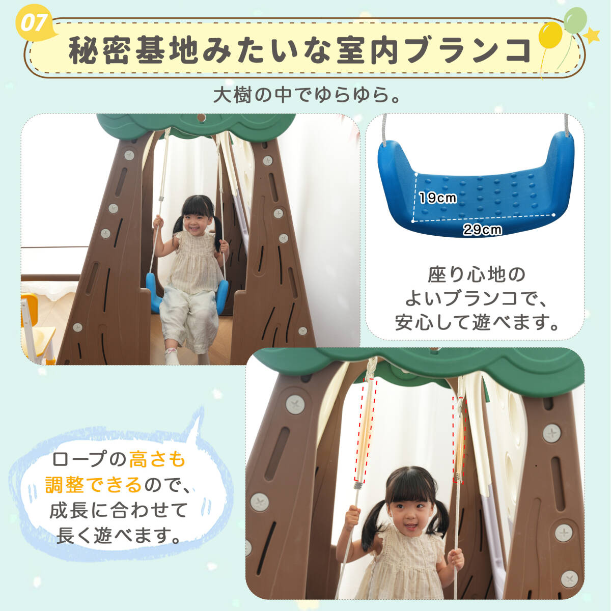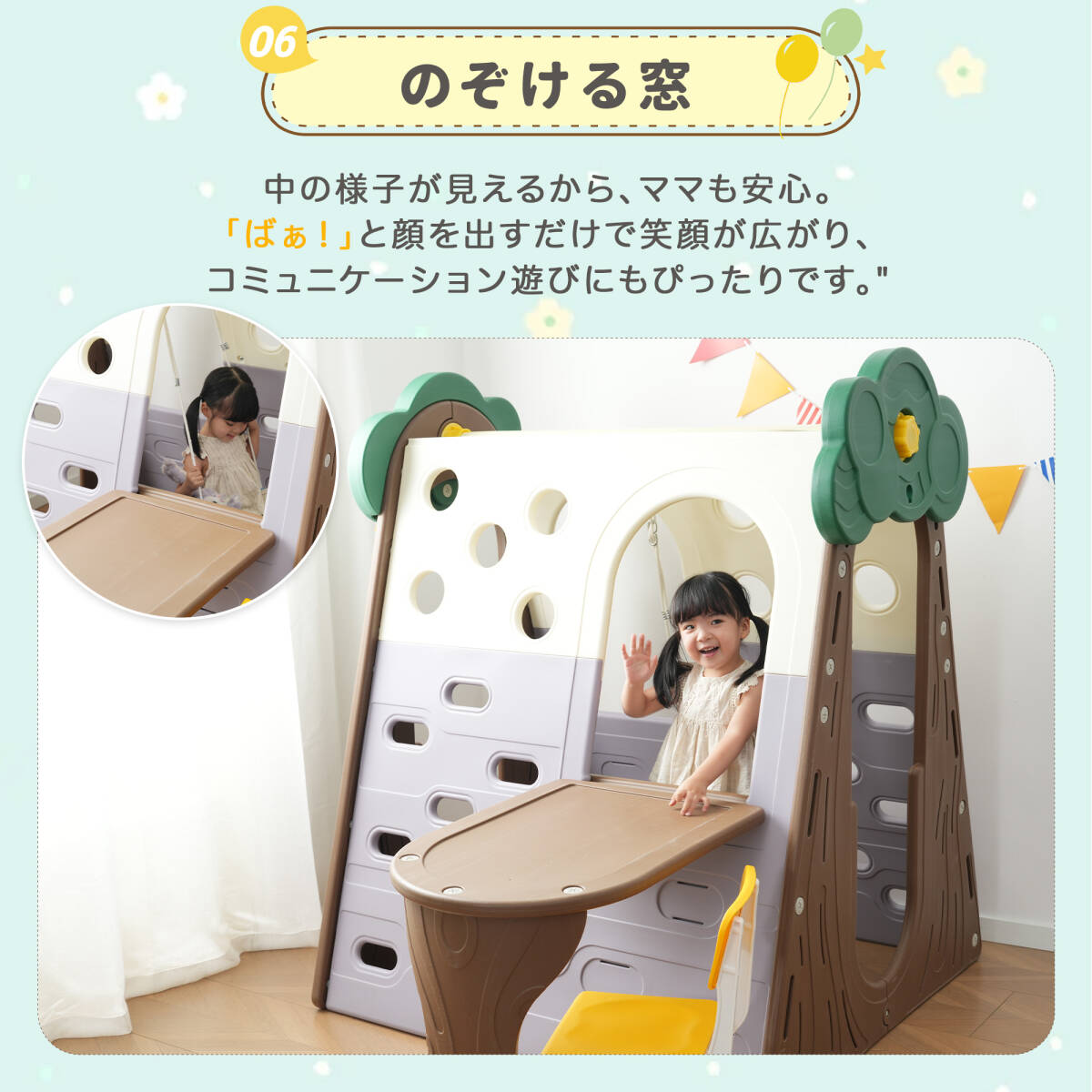 • ◎08【のぞける窓】中の様子が見えるから、ママも安心。「ばぁ!」と顔を出すだけで笑顔が広がり、コミュニケーション遊びにもぴったりです。【秘密基地みたいな室内ブランコ】大樹の中でゆらゆら。座り心地のよいブランコで、安心して遊べます。ロープの高さも調整できるので、成長に合わせて長く遊べます。