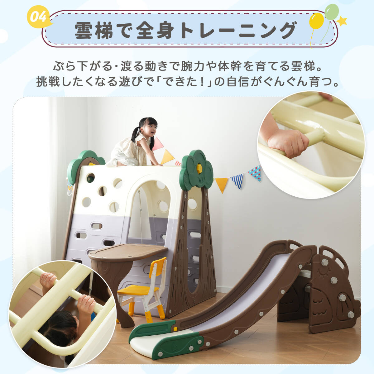 • ◎01【森モチーフのジャングルジム】おうちの中に「小さな森」をつくろう。すべる・登る・揺れる・投げる・学ぶ。成長につながる遊びがぎゅっと詰まった、ワクワクいっぱいのジャングルジムです。雨の日も、外に行けない日も。遊びのバリエーションセット:滑り台 ジャングルジム 雲梯 テーブル&チェア ブランコ バスケットゴール 投げ袋