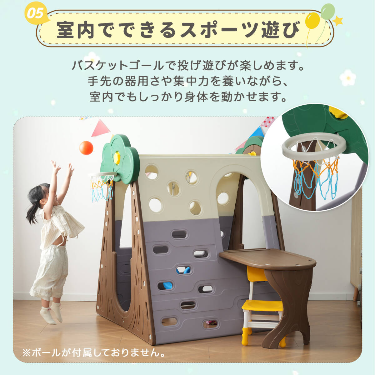 • ◎07【室内でできるスポーツ遊び】バスケットゴールで投げ遊びが楽しめます。手先の器用さや集中力を養いながら、室内でもしっかり身体を動かせます。