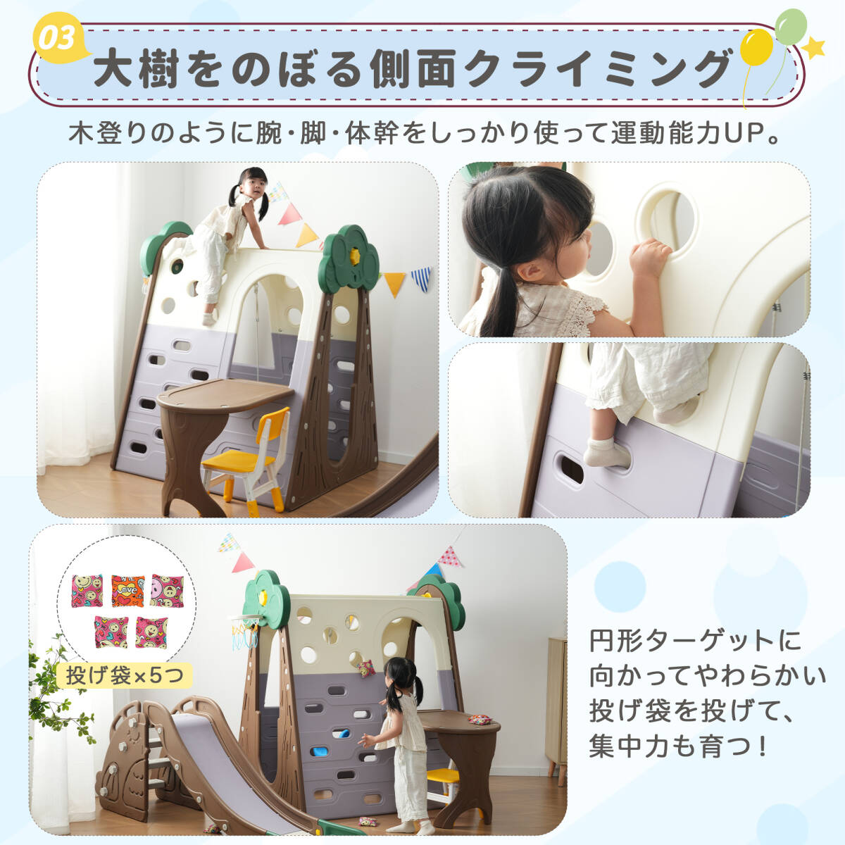 • ◎04【大樹をのぼる側面クライミング】木登りのように腕・脚・体幹をしっかり使って運動能力UP。円形ターゲットに向かってやわらかい投げ袋を投げて、集中力も育つ!