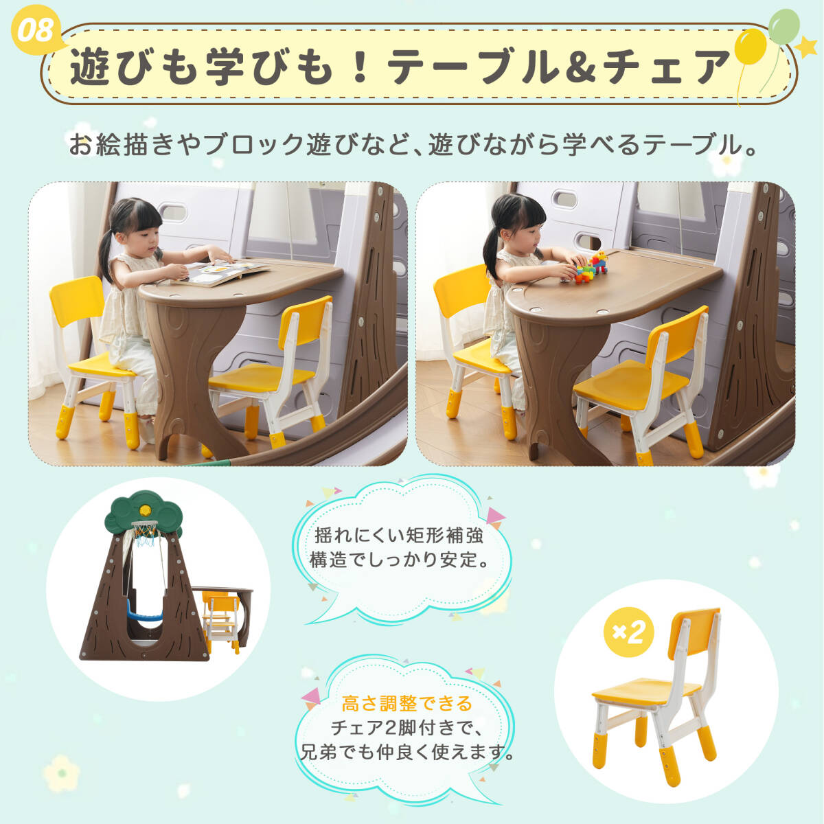 • ◎06【遊びも学びも!テーブル&チェア】お絵描きやブロック遊びなど、遊びながら学べるテーブル。揺れにくい矩形補強構造でしっかり安定。高さ調整できるチェア2脚付きで、兄弟でも仲良く使えます。