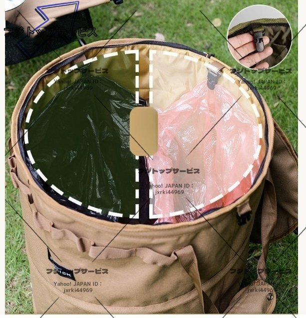 上蓋のジッパーコンパートメントメッシュバッグはゴミ袋や小物などを収納でき、ループ付きでツールを吊り下げることができ、ゴミ箱としてはもちろん、キャンプ用品やランドリー、ストーブの収納に便利!