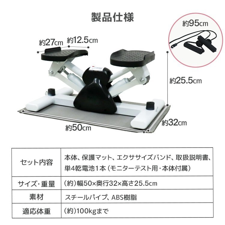 \初心者さんからシニアまで!ながら運動で有酸素運動を/ ステッパーが自宅にあれば、テレビや会話を楽しみながら気軽に体を動かすことができます。 有酸素運動・筋トレ・体幹トレーニングなど、これ1台で様々なトレーニングができます! 体幹の筋肉を鍛えることで痩せやすい体へ!体の芯が安定し、姿勢の改善にも効果的です! 高耐久シリンダーを採用。120分の連続使用が可能です。 4モード付モニター搭載!運動目安が分かりやく、毎日欠かさずトレーニングできます。 コンパクトな設計で、女性でも軽々持ち運べる♪省スペースに収納できます。 【商品仕様】 ・カラー:ブラック×ホワイト ・サイズ:(約)幅50×奥行32×高さ25.5cm ・商品内容:本体×1、保護マット×1、エクササイズバンド×1、取扱説明書×1、単4乾電池 ×1 ※乾電池は試運転のものとなり電池残量が少ない場合がございます※ ・耐荷重:(約)100kgまで ・連続使用:120分 ・素材:スチールパイプ、ABS樹脂 【注意事項】 ・トレーニングの際には無理のない範囲でご使用下さい。 ・体調の悪い状態での使用はおすすめしません。 ・必ずマットなどを敷いてご使用下さい。 ・商品は、モニターによって色合いが異なって見える場合があります。 ・仕様・デザインは改良のため予告なく変更することがあります。 |