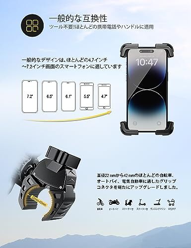 【幅広い互換性】Grefayバイクスマホマウントは、Phone 14 13 12 11Mini、Pro Max、Xs、XR、X、8、7を含む4.7インチから7.2インチのGPS対応デバイスと互換性があります。7s、6s、6 Plus; Huawei P30 Pro、10 Pro、P20、P10; S10+、S10、S9+、S9+、S8+、S8、S7、S6; Note 9、8、7.6; Google Nexusだけでなく、LG、HTC、Nokiaおよびその他のスマートフォンにも対応します。