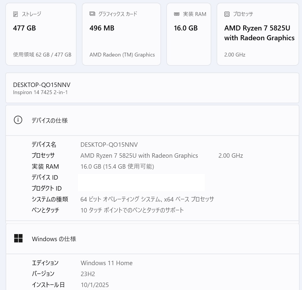 Dell Inspiron 14 7425 2 in 1 P161G タッチパネル AMD Ryzen 7 5825U/メモリ 16GB/SSD 512GB/14型 WUXGA 光沢/Win11/Office24 23年製