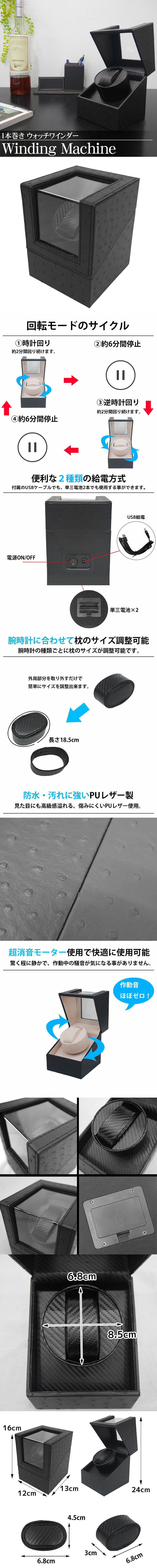※商品のカラーは画像一枚目のものになります。 高級感溢れるシックなデザインのワンディングマシーン 型押しPUレザーのボディが上品で豪華な雰囲気を醸し出し、どんなインテリアにも馴染むシンプルなデザインで 時計を守るケースであると同時におしゃれなインテリアとしてお部屋を豪華に飾ってくれます。 ●便利な2種類の給電方式● 付属のUSBケーブル、または単三電池で給電可能です。 有線でも無線でも使え、場所に縛られずに使用出来ます。 ●抜群の静音設計● 磁化なしの設計で、動作中の騒音はほぼゼロに近く、驚くほどの静音性を持っています。 寝室、書斎等に置いて使用しても気になりません。 ●高級感溢れるPUレザー● 汚れや水に強く、傷みにくいPUレザー使用。 精巧なデザインで手触りも滑らかです。 ●巻き上げパターン● 時計回り2分間→停止6分間→逆時計回り2分間→停止6分間のパターンをループします。 ●時計に合わせて枕(クッション)のサイズ調整可能● 腕時計の種類に合わせ、クッションの外側を外して厚みを変えれば クッションのサイズを変えられます、レディース時計もメンズ時計も兼用可能です。 ●商品詳細 サイズ:画像をご参照ください カラー:ブラック(オーストリッチ) 重量:(約) 0.65kg ・内容 ワインディングマシーン本体×1 (腕時計クッション×1) 給電用USBケーブル×1 簡易英文説明書×1 ※単三電池は付属しておりません。 |