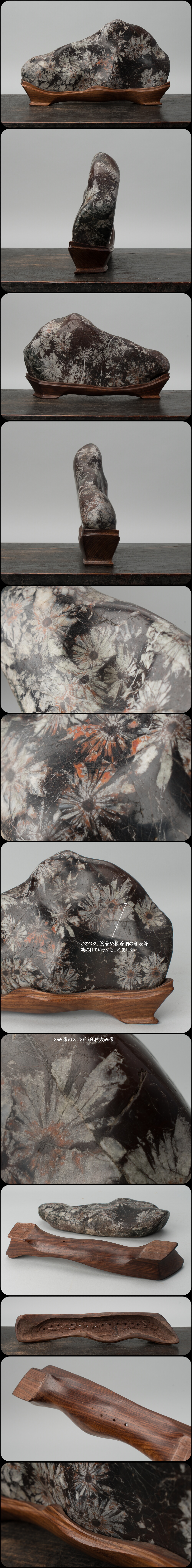 | 菊花石。木製の台付。 サイズは、幅約28.5cm、高さ約16.5cm(台含む)。 石のみの重さ2.7㎏。 重さは家庭用秤での測定ですので誤差あります。 石に亀裂あり、1箇所は接着かヒビを埋めてあるかもしれません。 画像でご確認ください。 台に傷あります。 状態・詳細は、画像でご確認お願いいたします。 |