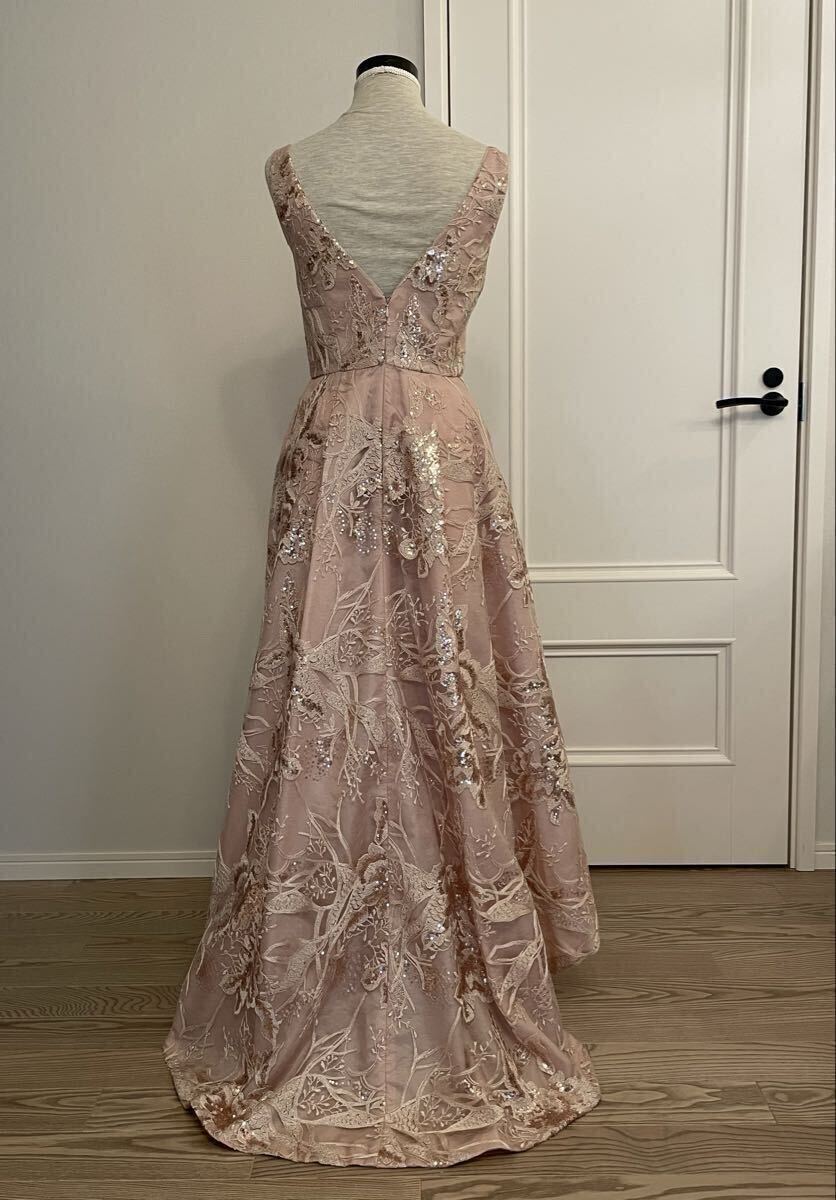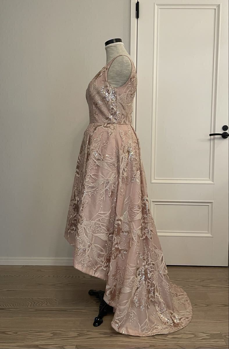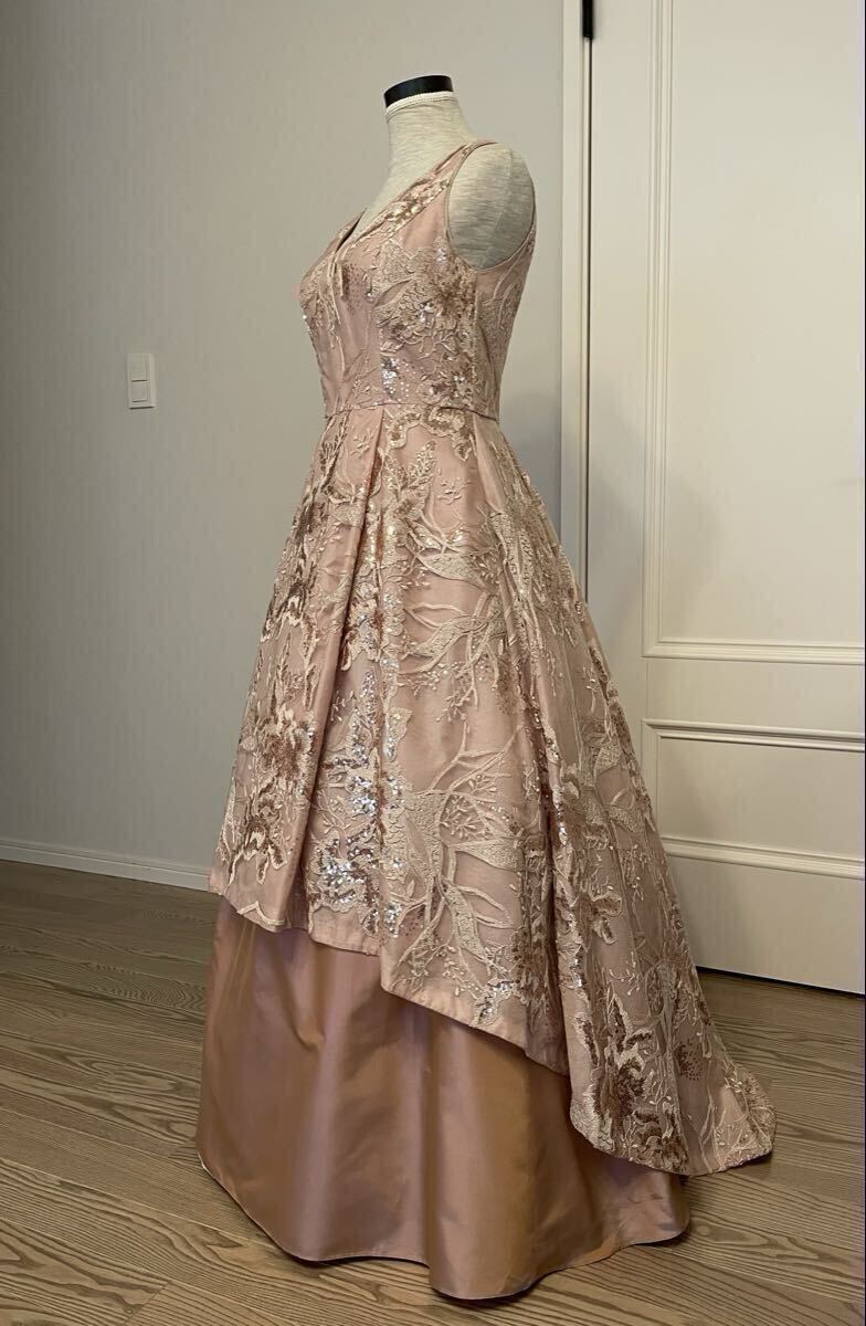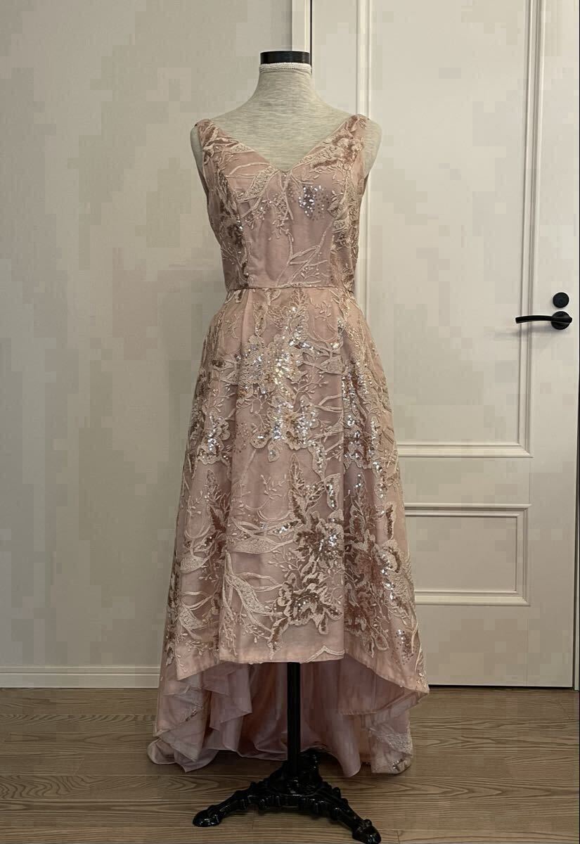 前が短く、後ろが長いドレスですので、膝下から脚先までが見えるデザインです。