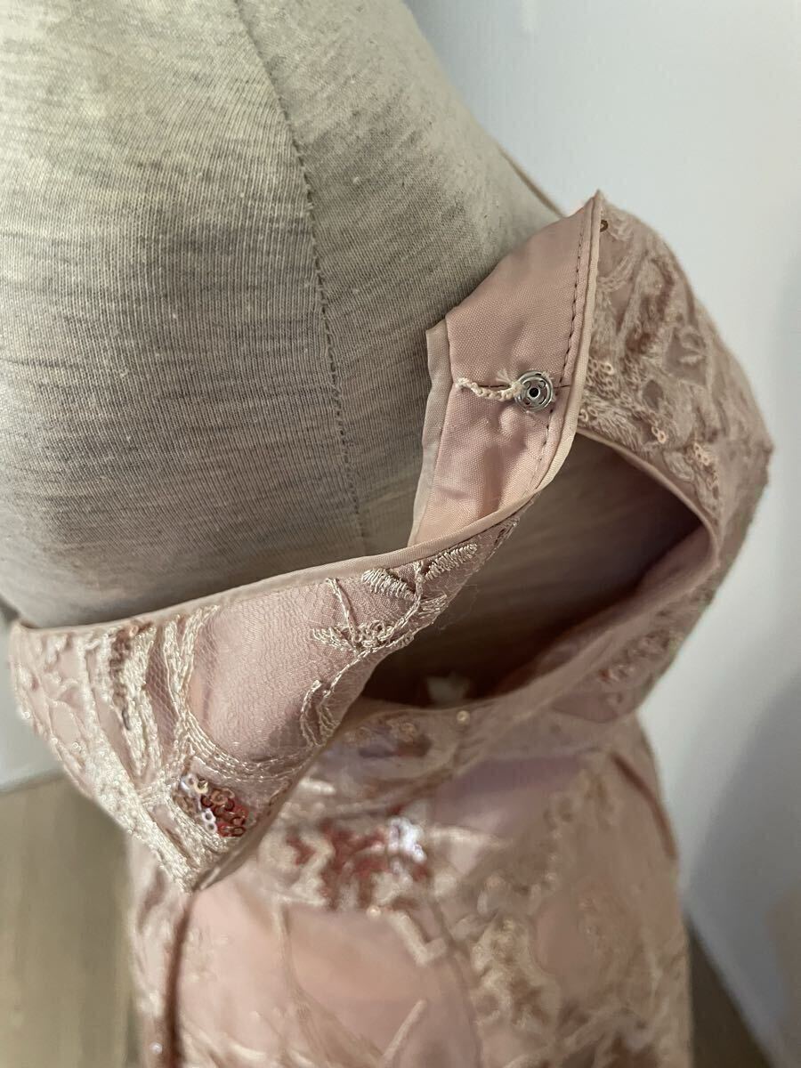 アンダースカートも同系のサーモンピンクですが、シャンブレーの光沢で茶色っぽく写っています。