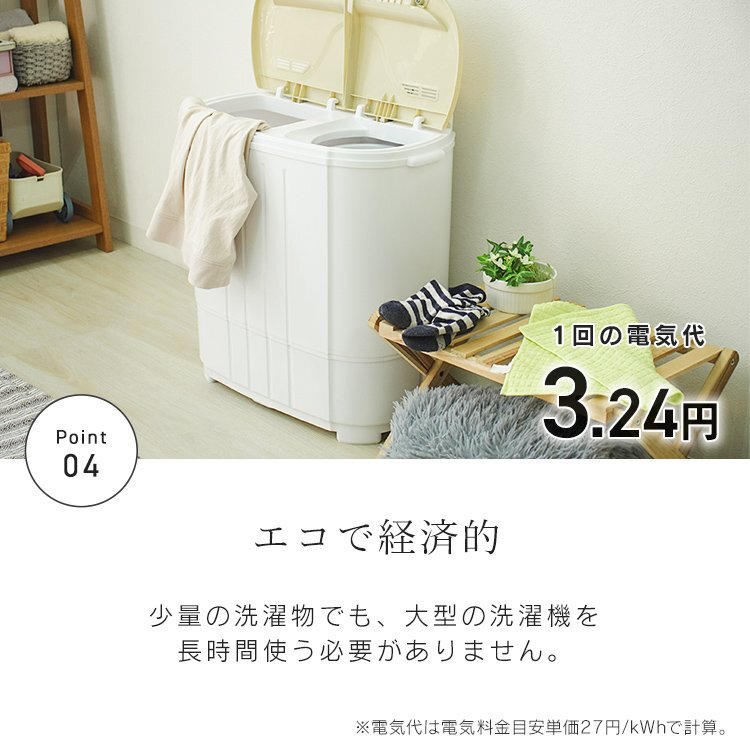 | 【安心の1年保証付き】 コンパクトだから場所も取らずにちょこっと洗いで節水もできます。 少量の洗濯物や洗い分けに最適! 二槽式だからしっかり洗える! ★こんな場合にオススメ!★ ・ガーデニングや作業で汚れた軍手やエプロンの洗濯 ・学校や部活動で汚れたシューズや服の下洗い ・ベビー用衣類の洗濯 ・海水浴後の水着の洗濯 ・別洗い用のサブ機として 【商品内容】 本体 脱水用おさえさえフタ 吸水ホース 【商品詳細】 カラー:ベージュ サイズ:(約)幅550×奥行360×高さ590mm 重量:(約)9㎏ 洗濯容量:3.6kg 電源:AC100V 50/60Hz 定格電力:洗濯:240W 脱水:120W 防水性能:IPX4 ・本製品の脱水は、簡易脱水となっております。あらかじめご了承ください。 ・水がこぼれても大丈夫な風呂場やベランダなどでのご使用をオススメします。 ・分解や修理・改造をしないでください。 ・保管する時は、風雨にさらされる場所や湿気の多い場所に置かないでください。 |