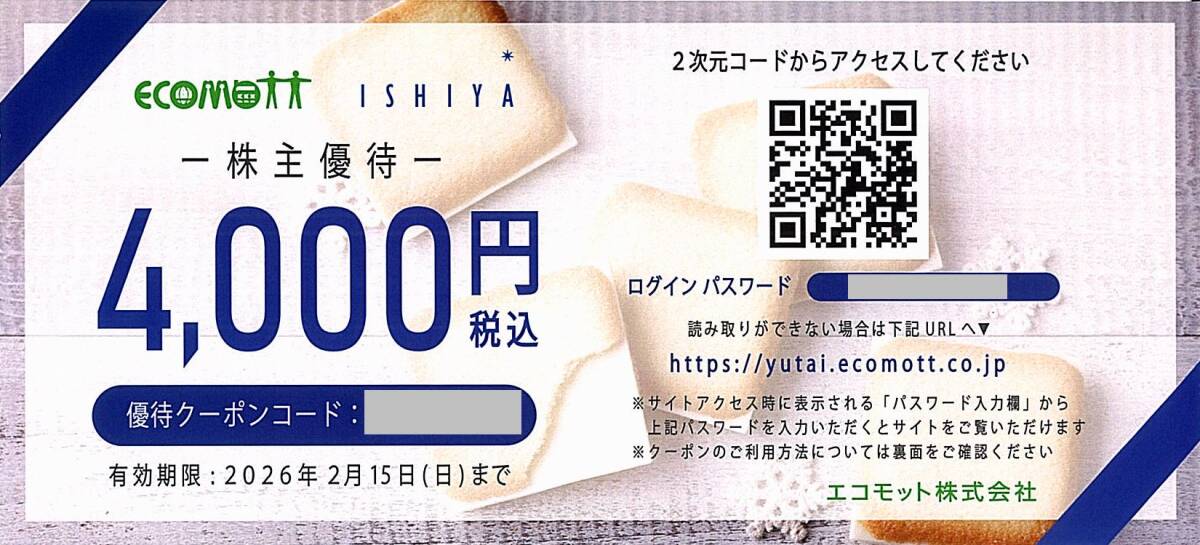「エコモット 株主優待券」 イシヤオンライン 優待クーポン【4000円割引】 ※番号通知のみ / 有効期限2026年2月15日